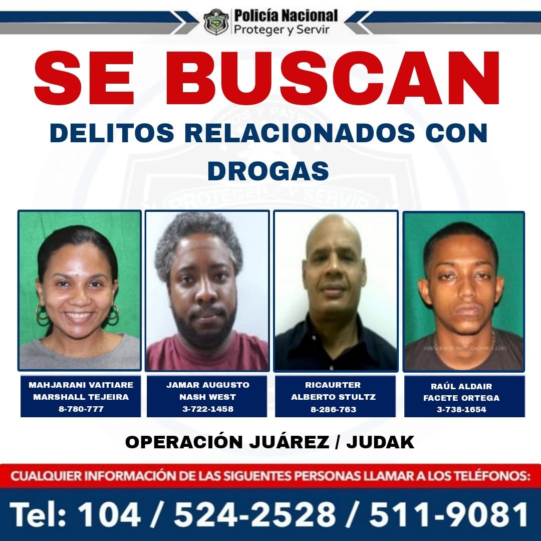 Cuatro mujeres y tres hombres conforman la reciente lista de Más Buscados publicada por la Policía Nacional, la cual hace referencia a personas requeridas por la Fiscalía Primera Superior de Drogas, por delitos Relacionados con Drogas y Blanqueo de Capitales. Entre estos figuran 4 objetivos por capturar de la Operación Juárez y Judak, donde fueron aprehendidas 35 personas y decomisado 14 autos y más de 66 mil dólares en efectivo. Asimismo, se hace público el rostro de Lissette Díaz requerida en la Operación Jade, y Ginette Zurita y Eliza Julián, requeridas por la Operación PTY. La Policía Nacional solicita a la población que de mantener información que permita dar con la ubicación de estas personas, se brinde de forma anónima a la línea 104 o a través de los teléfonos 524-2528 o 511-9081. |