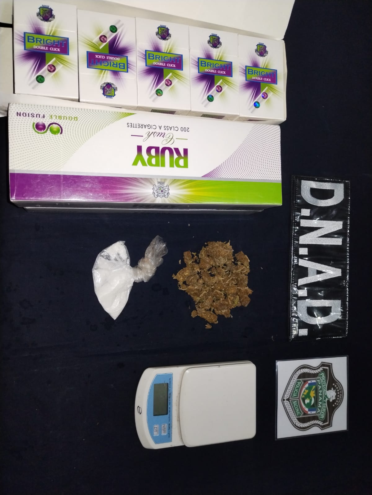 Unidades de la Dirección Nacional Antidrogas de la Policía Nacional actuando en coordinación con funcionarios del Ministerio Público, incautan sustancias ilícitas y aprehenden a dos personas presuntamente vinculadas al hecho delictivo en la provincia de Coclé. En la acción policial de allanamiento y registro a una residencia ubicada en el Corregimiento de Barrios Unidos, Sector de El Nazareno se da con el hallazgo de 40 Cajas de cigarrillos, una bolsa plástica transparente anudada en uno de sus extremos contentiva de un polvo blanco que se presume sea cocaína, cierta cantidad de material vegetal seco que se presume sea sustancia ilícita y una pesa digital.