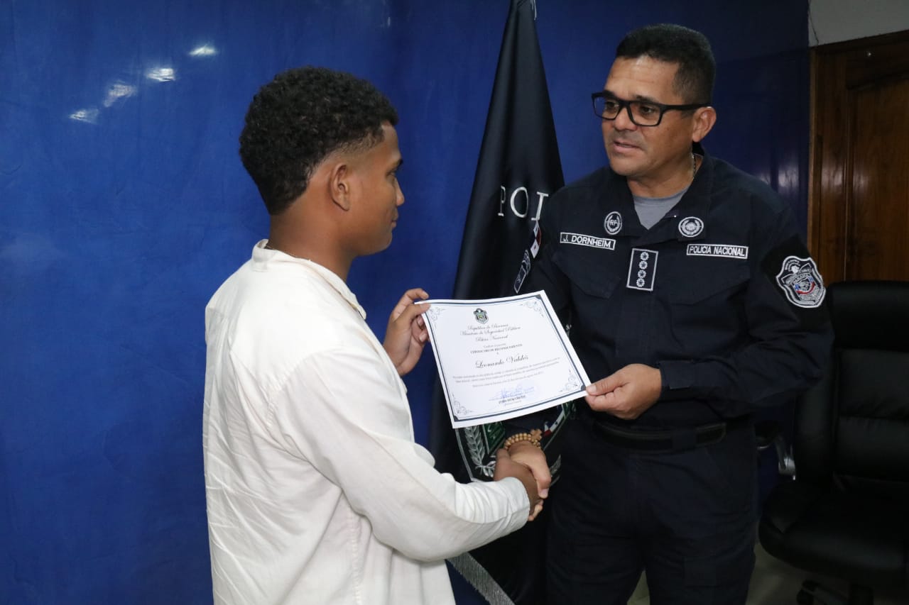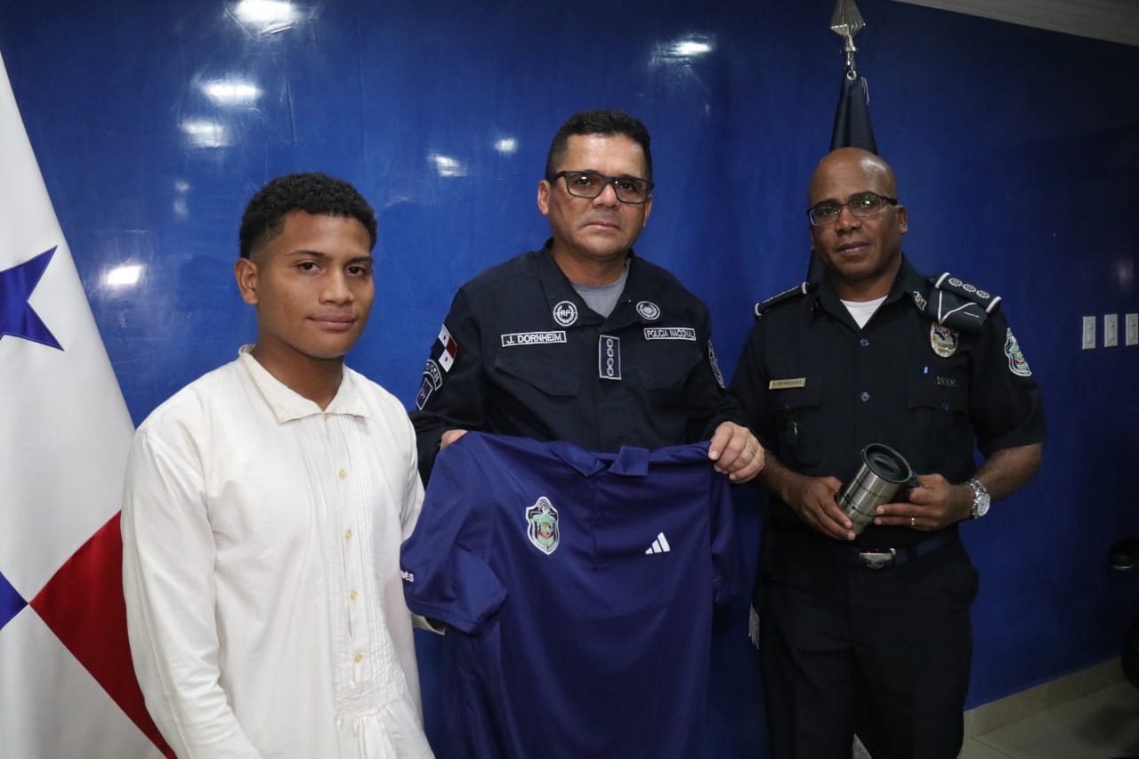 Los tres estudiantes graduandos Leonardo Valdéz, Yoselin Torres y Francisco Aguirre, fueron invitados al Salón Azul de la Policía Nacional en una visita de cortesía donde fueron recibidos, por el Ministro de Seguridad Pública, Juan Manuel Pino, así como el Director General de la Policía Nacional, John Dornheim, el Subdirector General, Simón Henríquez y miembros del Directorio Policial. En medio de la reunión los estudiantes recibieron obsequios y certificados de reconocimiento por su heroica y humanitaria labor, que realizaron para proteger a una persona herida por las inmediaciones de la vía Israel. Sus valores éticos y humanos, el ímpetu, la valentía y el amor al prójimo tallaron el modelo ejemplar que tienen, a pesar de ser adolescentes, son héroes de la Patría. La Policía Nacional a través de los Programas de Desarrollo Humano que desarrolla en los centros educativos del país, mantiene una cultura de paz, dirigidos al futuro de la Nación Panameña y que la ciudadanía promueva tanto en el hogar, como en su entorno social. Felicidades a estos estudiantes graduandos, de un Centro Educativo de la Ciudad Capital, por su altruismo que salvaguardó la vida y honra de una persona con heridas de gravedad, delito perpetrado el pasado 16 de agosto de 2023. |