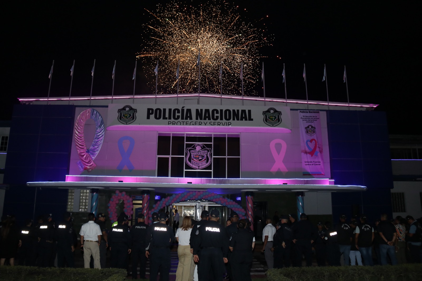 POLICÍA NACIONAL REALIZA ENCENDIDO DE LUCES ALUSIVO A LA CINTA ROSADA Y CELESTE CONTRA EL CÁNCER