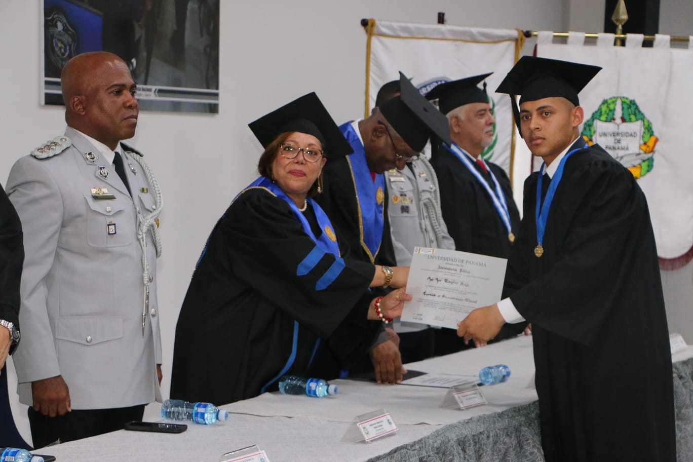 Luego de 4 años de sacrificio y entrega, ocho alféreces entre ellos una femenina de la Escuela de Oficiales Dr. Justo Arosemena (ESOPOL), recibieron este jueves, 14 de diciembre sus diplomas que los acreditan como Licenciados en Administración Pública Policial de la Universidad de Panamá. La ceremonia se realizó en el auditorio del Instituto Superior Policial (ISPOL), ubicado en Gamboa, con la presencia del Subdirector General de la Policía Nacional, Simón Henríquez , miembros del Directorio Policial, así como de las altas autoridades de la Universidad de Panamá y de la Facultad de Administración Pública. “Esta es una carrera noble, agradezco a la Universidad de Panamá, a los docentes y también a la Policía Nacional por preparar a estos estudiantes para brindar seguridad a nuestros ciudadanos, desearle éxitos en un ambiente operacional cambiante, nuestra recompensa es garantizar la paz y la sana convivencia ciudadana” dijo el Subdirector de la Policía Nacional, Simón Henríquez , en su intervención. El Subcomisionado Francisco Castro, Jefe de la Escuela de Oficiales de Policía, detalló que ya son 23 años que se mantiene este convenio con la Universidad de Panamá, y que ha sido de gran beneficio académico para los nuevos subtenientes de la Patria. Entre los nuevos licenciados, se destacan los primeros tres puestos: Rosa Arrocha , Addiel Rodríguez y José Ulloa respectivamente. Las personas que obtienen la Licenciatura en Administración policial están formadas para ejercer la gestión de planificación, organización, toma de decisiones, estadística y realización de planteamientos estratégicos aplicados con gran liderazgo en conformidad con la figura uniformada. |