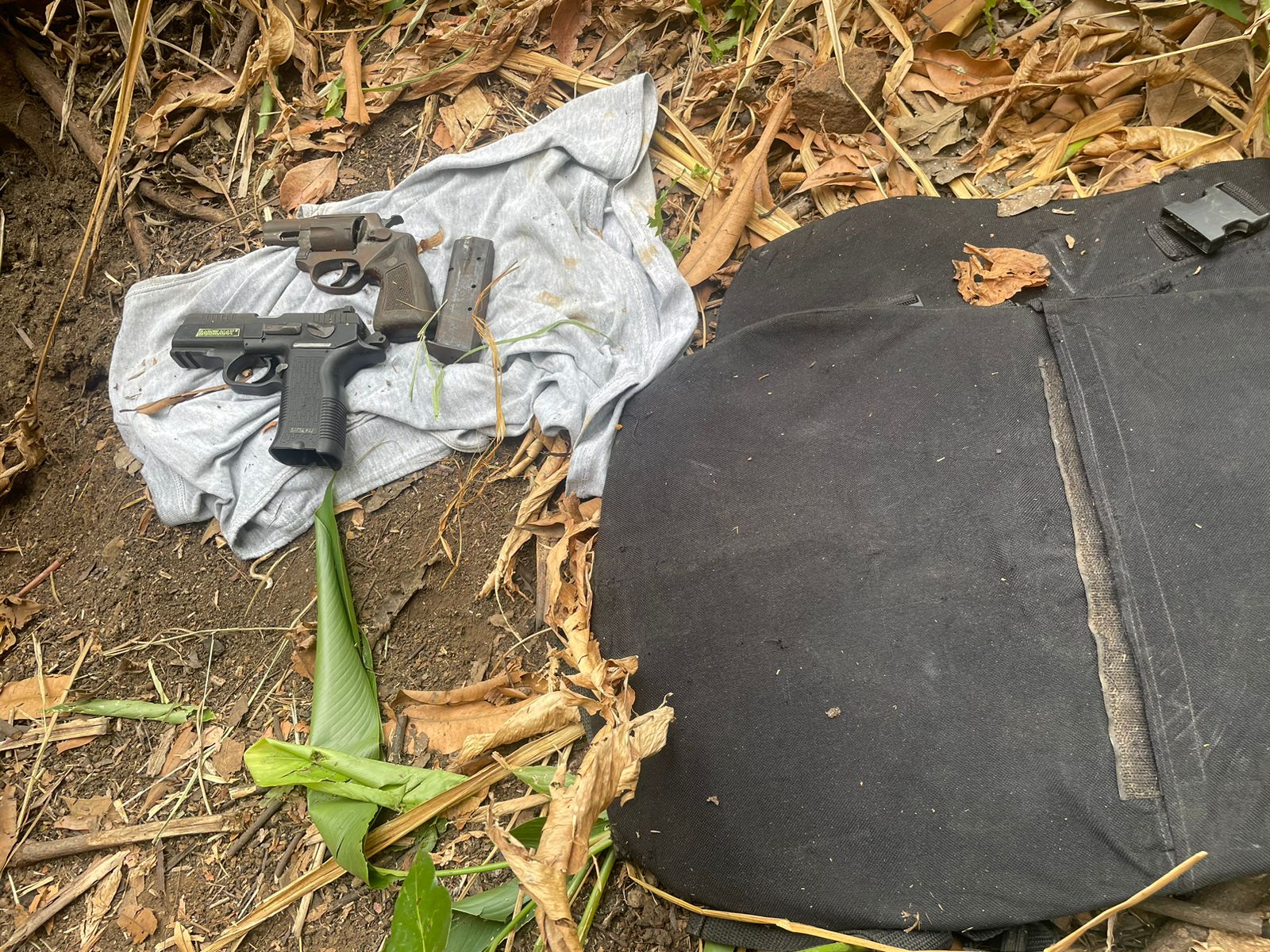 La Policía Nacional mediante acciones preventiva da con el hallazgo de dos armas de fuego, una chaleco balístico y la aprehension de dos menores presuntamente vinculados en un hecho donde una persona resulta herida con arma de fuego dijo el Comisionado Edgardo Núñez, Jefe de la Zona Policial de Don Bosco. Esta acción policíal se da luego de varias diligencia de allanamientos juntos al Ministerio Público a dos residencias ubicadas en la barriada Santa Bárbara, en el sector de San Joaquín, Pedregal. La Policía Nacional continúa con estos operativos para sarvaguardar la convivencia pacífica de nuestros ciudadanos. |