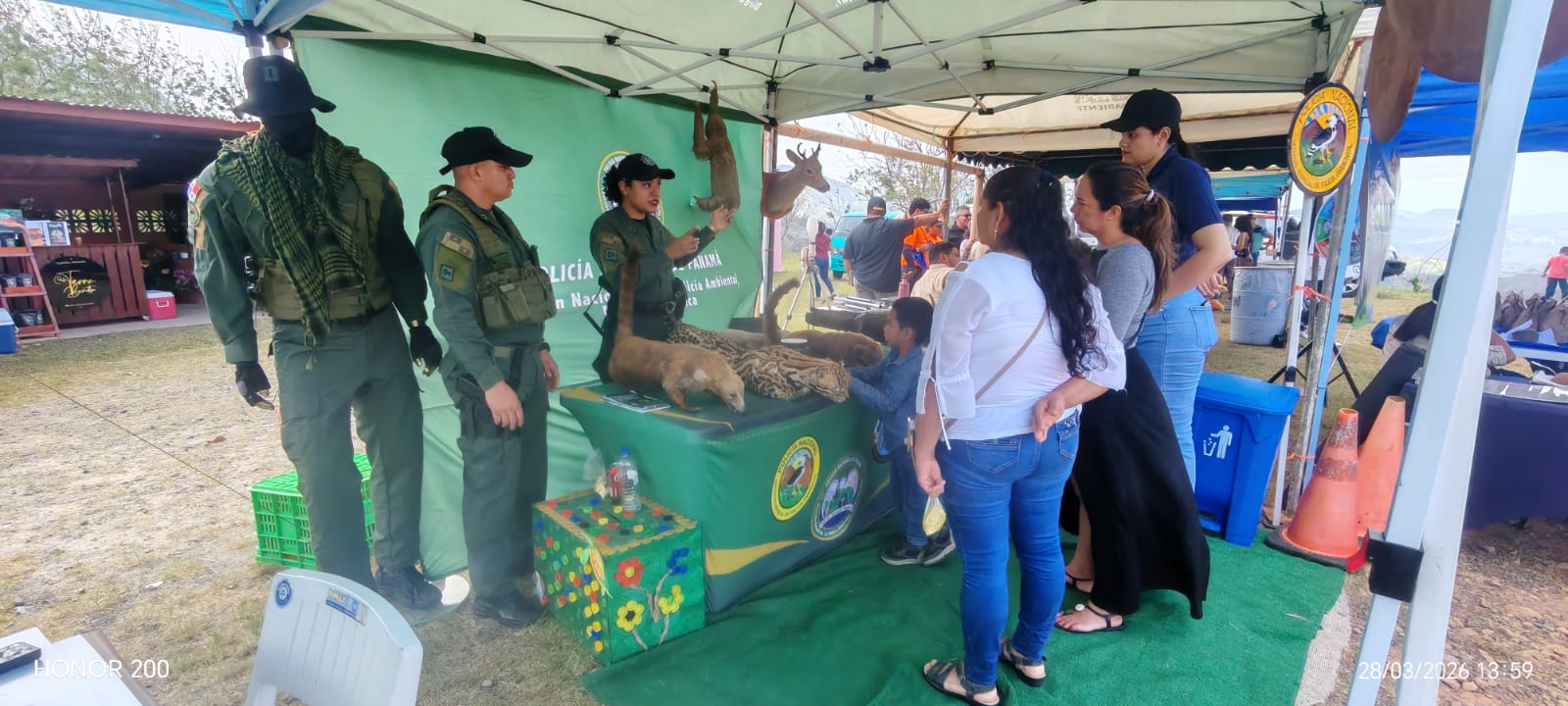 La Policía Nacional participó en la 1.ª Feria Ambiental “Comunidad y parques juntos por la conservación”, actividad organizada por el Ministerio de Ambiente, guardaparques y diversas organizaciones comunitarias y gubernamentales, en el cuadro deportivo de la comunidad de Limón de Campana. Durante la actividad, las unidades no solo mantuvieron presencia preventiva, sino que también brindaron orientación comunitaria e interactuaron directamente con los asistentes, promoviendo la cultura ambiental a través de un stand institucional y fortaleciendo la conciencia sobre la conservación de los recursos naturales. La Policía Nacional reafirma su compromiso con la seguridad y el bienestar de la población, integrando acciones de prevención con educación ambiental y participación ciudadana. |