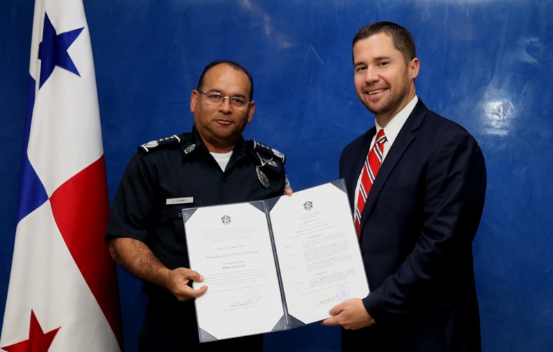 Martes, 31 de julio de 2018 a las 10:34 am Panamá 31 de julio 2018. El Subdirector General de la Policía Nacional, Jacinto Gómez impuso la medalla "Policía Nacional" a Brian Mulcahy, enlace de la Oficina... |