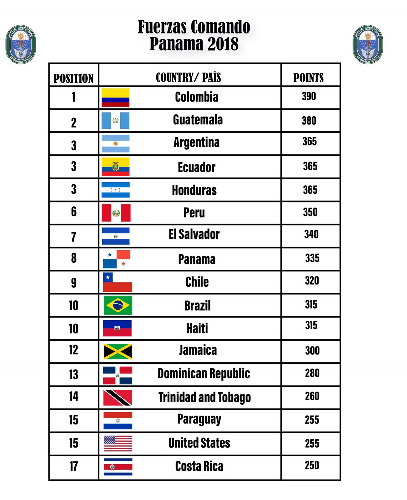 Viernes, 20 de julio de 2018 a las 8:00 am Luego del primer dìa de competencia en el torneo internacional de equipos especiales, "Fuerzas Comando 2018”, Colombia ocupa el primer lugar, seguido de Guatemala y Argentina, mientras que Panamá ocupa el octavo lugar.,, |