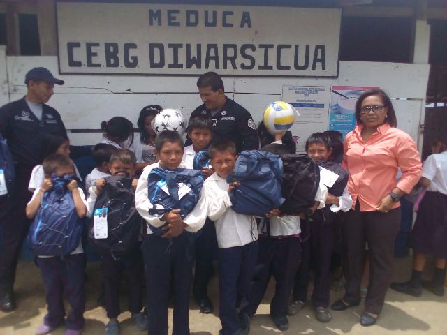 EN BAYANO UNIFORMADOS ENTREGAN ÚTILES ESCOLARES A ESTUDIANTES