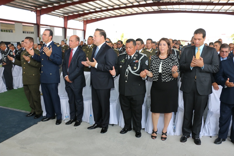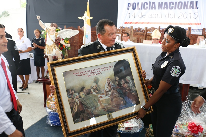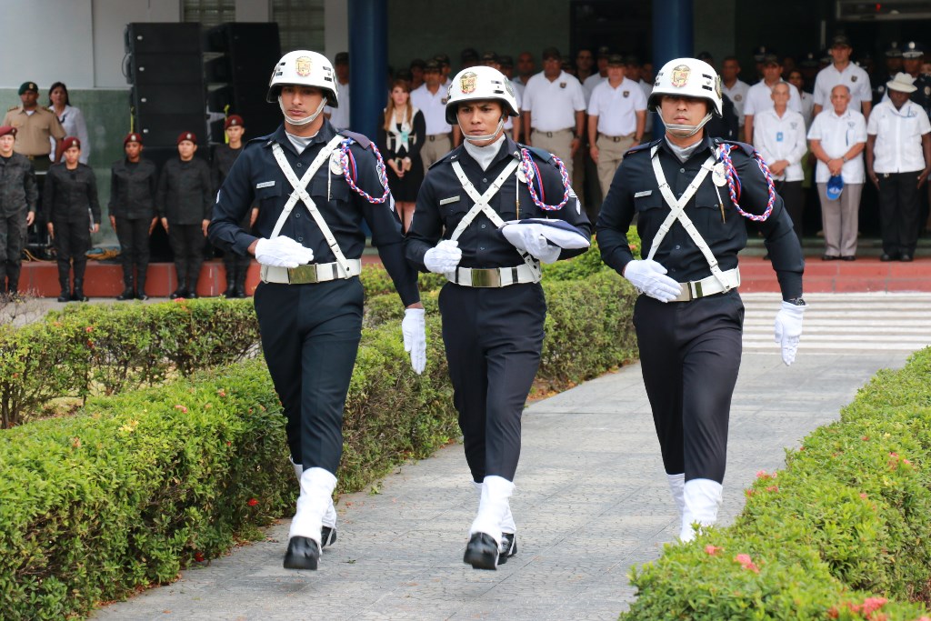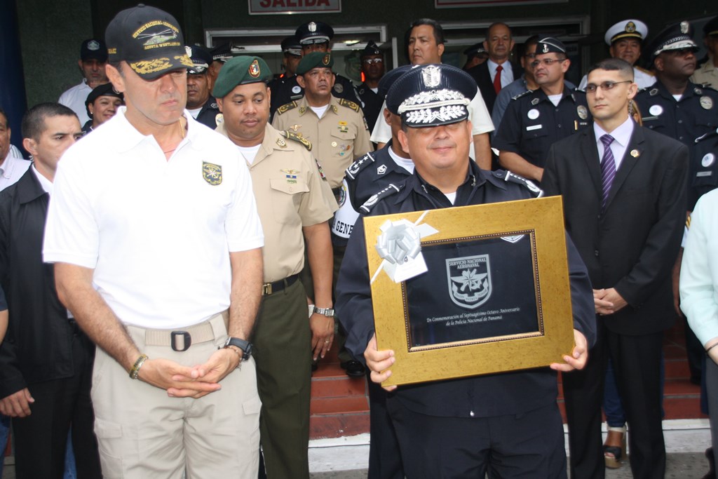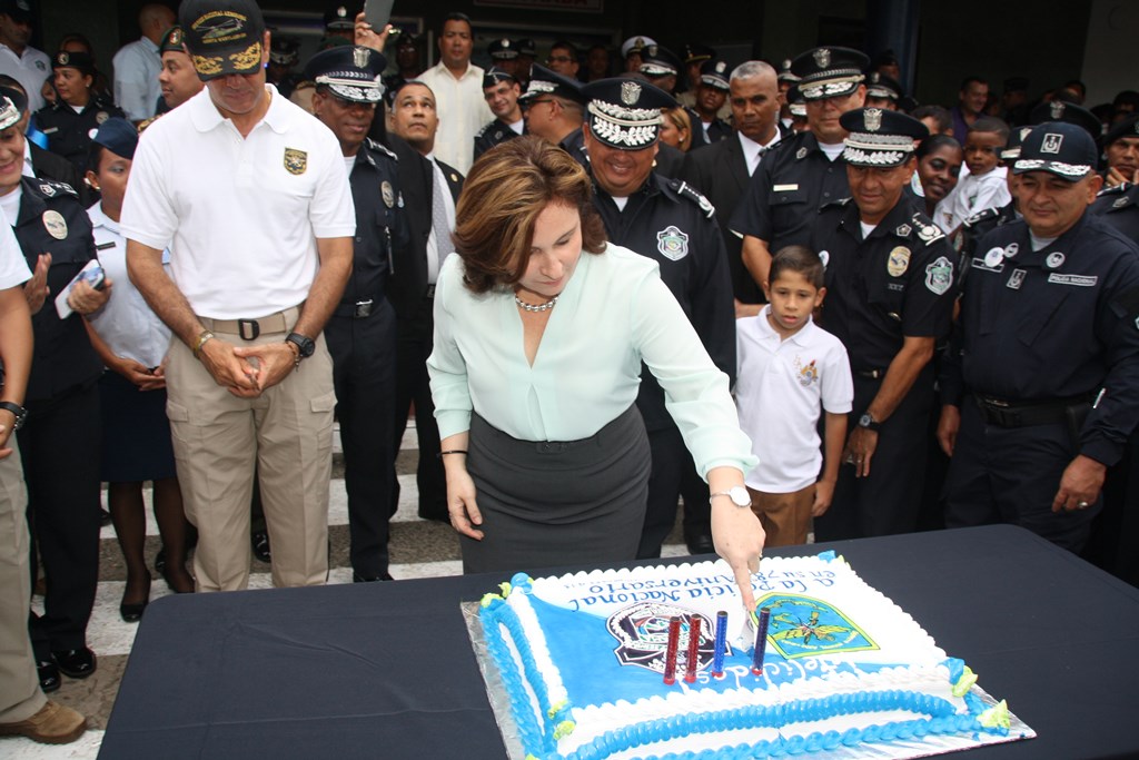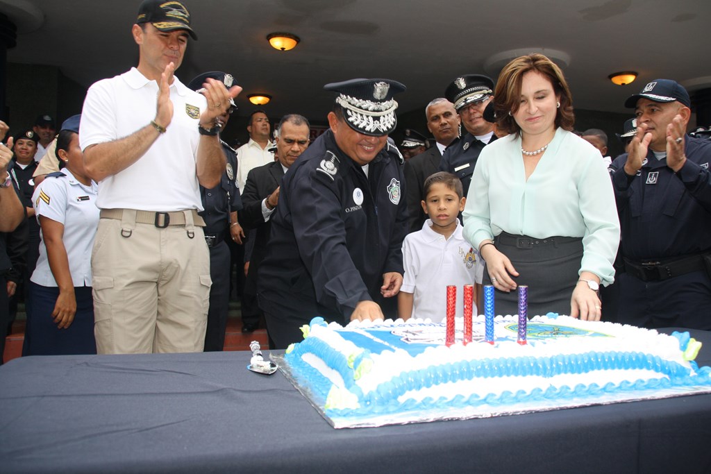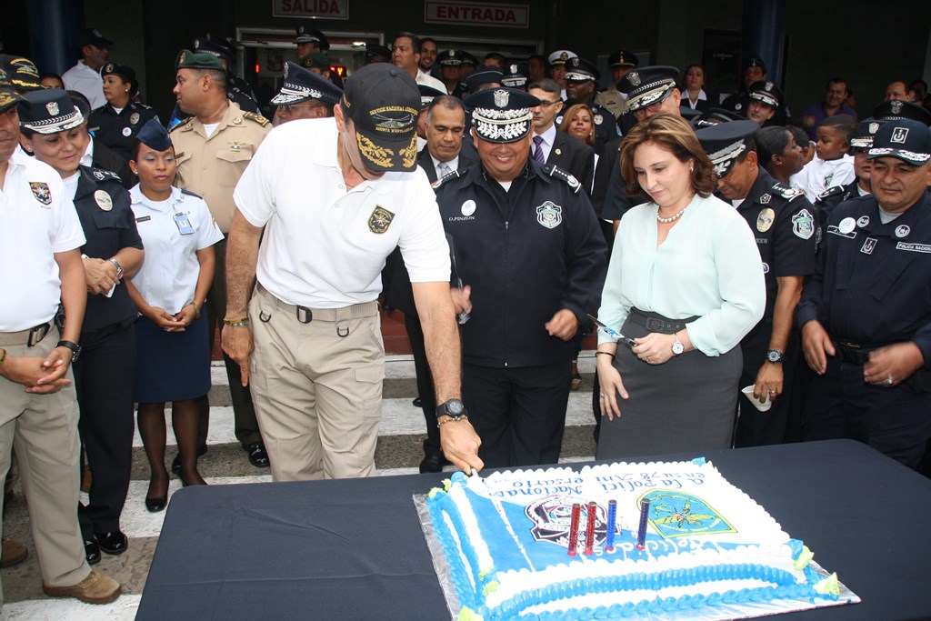 Con un despliegue de fuegos artificiales y dianas, los más de 18 mil hombres y mujeres que conforman la Policía Nacional (PN) arrancaron la conmemoraron el sexagésimo aniversario del "Día del Policía". La alegría y el entusiasmo en cada una de las unidades que se dieron cita en la sede de la PN de Ancón, reflejaba la satisfacción de cumplir día a día la labor de Proteger y Servir a la ciudadanía. El momento fue oportuno para cantar el cumpleaños y llevar a cabo el acto cívico, donde se hizo entrega de placas de reconocimiento a varias unidades, entre estas, a miembros del Servicio de Protección Institucional (SPI) y el Servicio Nacional de Fronteras (SENAFRONT). De la misma forma, el Director del Servicio Nacional Aeronaval (SENAN), Belsio González otorgó un reconocimiento por esta fecha especial al Director General de la PN, Omar Ariel Pinzón Marín. Además felicitó a todas las unidades en su día por su labor de sacrificio y valor. Entre las figuras que asistieron a estas actividades se encontraba la Procuradora General de la Nación Kenia Porcell, así como varios agregados militares, policiales y miembros del directorio general. Seguidamente, bajo las palabras del Monseñor Pedro Hernández, Obispo encargado de la Fuerza Pública de Panamá, aprovechó para resaltar el esfuerzo de los uniformados. “Un estamento de seguridad siempre necesita estar bajo la presencia de Dios”, aseguró el Monseñor. La ceremonia religiosa se dio con la participación del Excelentísimo señor Presidente de la República, Juan Carlos Varela Rodríguez. Durante el acto el gobernante panameño, felicitó a toda la Policía Nacional y al resto de los estamentos de seguridad por su ardua labor en pro de la seguridad de todos los que habitamos esta nación. El Mandatario también realizó un importante reconocimiento al sargento segundo Jairo Torres, a quien obsequió un vehículo para facilitar el traslado a sus citas médicas, debido a que resultará lesionado durante una acción policial. También se realizaron entrega de Biblias y cuadros conmemorativos como premios a varias unidades. El Ministro de Seguridad Rodolfo Aguilera participó de igual forma de la ceremonia reliogiosa. El momento fue oportuno para que una vez más los hombres y mujeres que integran esta loable institución de seguridad se desprendieran un poquito de su labor de brindar seguridad, para entregar canastillas en el Hospital Santo Tomás, Hospital del Niño y el de Especialidades Pediátrica. Como parte de la celebración, se realizó una maratón de aeróbicos donde participaron diversas categorías integradas por miembros de la PN, familiares e invitados especiales, donde continúo la alegría de los uniformados en su día. |