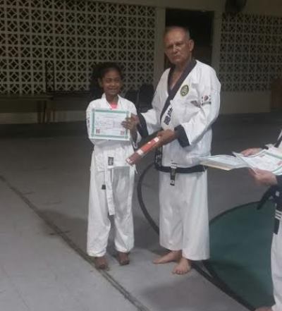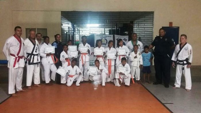 Niños y niñas del corregimiento de Curundú, que participan en la academia Tang Soo Do Kwan, fueron ascendidos a Cinta Amarilla por sus instructores. Los pequeños fueron certificados y les pusieron sus cintas amarillas al haber pasado por varias prácticas de Tang Soo Do, puestas por sus instructores. La Unidad Preventiva Comunitaria (UPC) de la Policía Nacional, apoya este tipo de deporte para ayudar a que más niños y jóvenes en riesgo social puedan integrarse a las diferentes actividades deportivas y así prevenir la delincuencia en este sector del país. “Me siento muy orgulloso de ver a los chicos crecer en el deporte y alejados de actos delincuenciales y de poder contribuir con el deporte y la seguridad de mi Panamá” expresó el teniente e instructor de Tang Soo Do, Royván Rudas de la UPC de Curundú. |