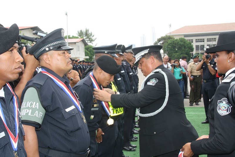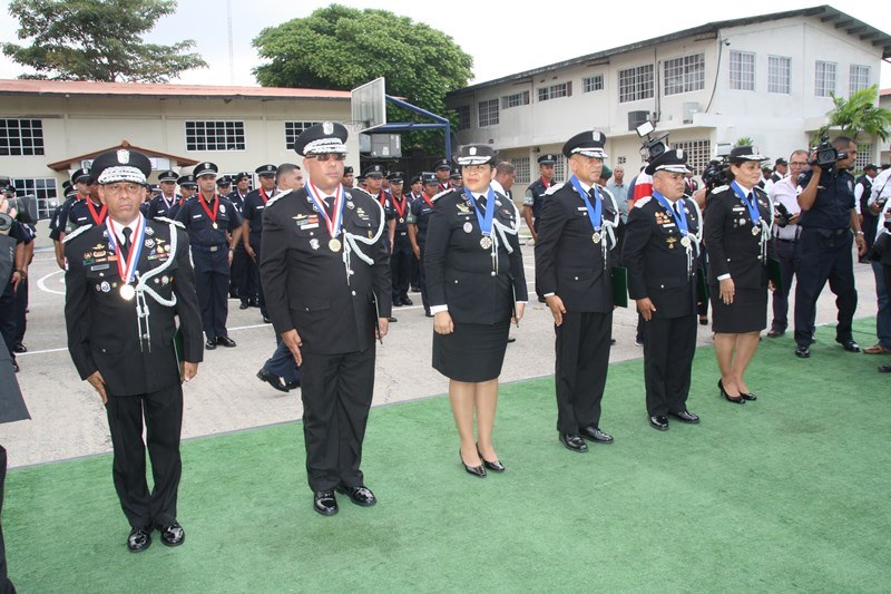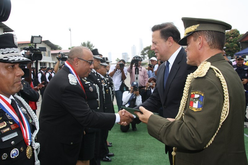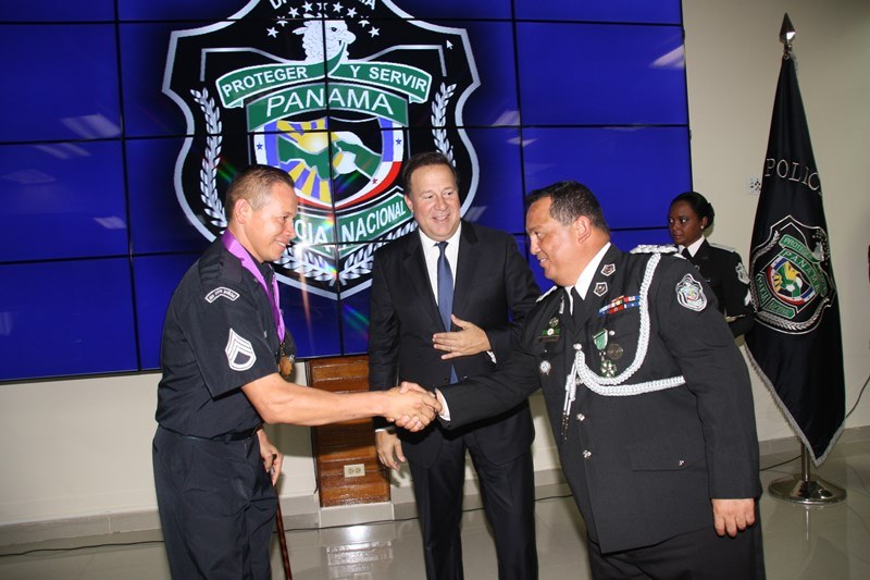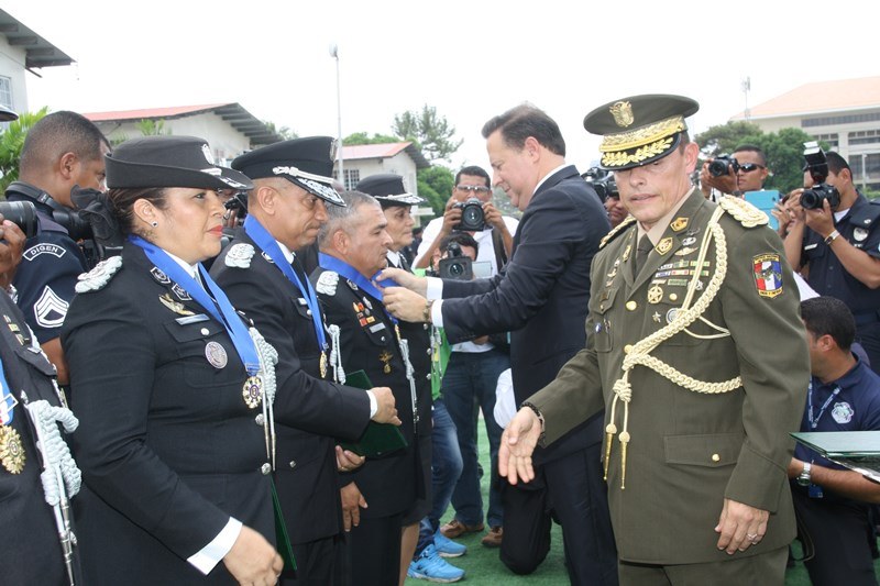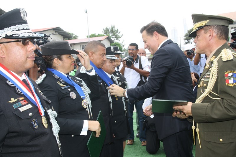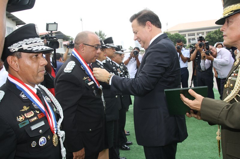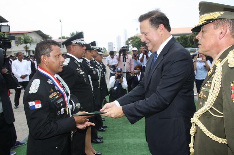 Unos 78 uniformados fueron condecorados con la medalla al "Servicio Distinguido", "Medalla al Mérito", "Medalla al Valor" y "Medalla al Sacrificio", en un justo reconocimiento durante la ceremonia realizada en la sede de la Policía Nacional, ubicada en el corregimiento de Ancón, en homenaje al Día del Policía. En este significado acto estuvo presente el Presidente de la República, Juan Carlos Varela quien en un emotivo discurso destacó la loable labor que realizan las unidades de la Policía Nacional a favor del país. "Felicito a este grupo de policías por tener siempre presente los valores que forman parte de la doctrina policial, además de ser ejemplo para al resto de sus compañeros y de la comunidad" destacó el Mandatario de la República. El Presidente resaltó que la disminución de los homicidios en los 4 primeros meses del año 2015 de los homicidios es el resultado de la unión existente entre los estamentos de seguridad. Igualmente, aprovechó la ceremonia para anunciar la creación del proyecto social “Fuerza de Esperanza”, que unirá a los estamentos de seguridad en la construcción de mejores y nuevas estructuras educativas a nivel nacional. En tanto, el ministro de Seguridad Pública, Rodolfo Aguilera Franceschi dijo que los policías son como “héroes silenciosos”, quienes realizan un trabajo extraordinario, que muchas veces pasan desapercibido, por lo que felicitó al Director de la Policía Nacional, por organizar este evento. El Director General de la Policía Nacional, Omar Pinzón Marín expresó que estos reconocimientos traen consigo un nivel distinto de responsabilidad, además de nuevas exigencias que deben encarar con renovada disposición profesional. “Este acto de condecoración es más que merecido, debe ser reconocido por sus superiores y la Patria”, destacó Pinzón. En la imposición de medallas fueron distinguidos uniformados de diferentes dependencias de la Policía Nacional y miembros del Directorio Policial. Propicio fue el momento, para hacerles entrega de medallas al Ministro de Seguridad Pública y directores de las diferentes entidades de seguridad, por sus aportes y trayectoria. Así mismo, como un homenaje especial, la embajadora de Colombia en Panamá, Gina Benedetti condecoró al Director General de la Policía Nacional Omar Ariel Pinzón Marín con la medalla Al Servicio Distinguido, en representación de su homologo, el Director General de la Policía Nacional colombiana, Rodolfo Palomino López. En esta ceremonia fueron condecorados con medallas “Al Mérito” y “Al Valor” a tres unidades policiales que producto de la labor realizada, quedaron discapacitados. Esta ceremonia que forma parte de las actividades en celebración del 78 aniversario del Día del Policía tiene como objetivo fortalecer el sentido de permanencia, respeto y amor por la profesión policial, que más que servir es entrega; además de convertirse en referencia a las futuras generaciones de uniformados que en su momento continuaran este importante legado. |