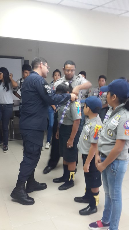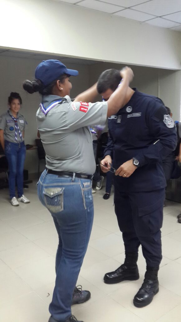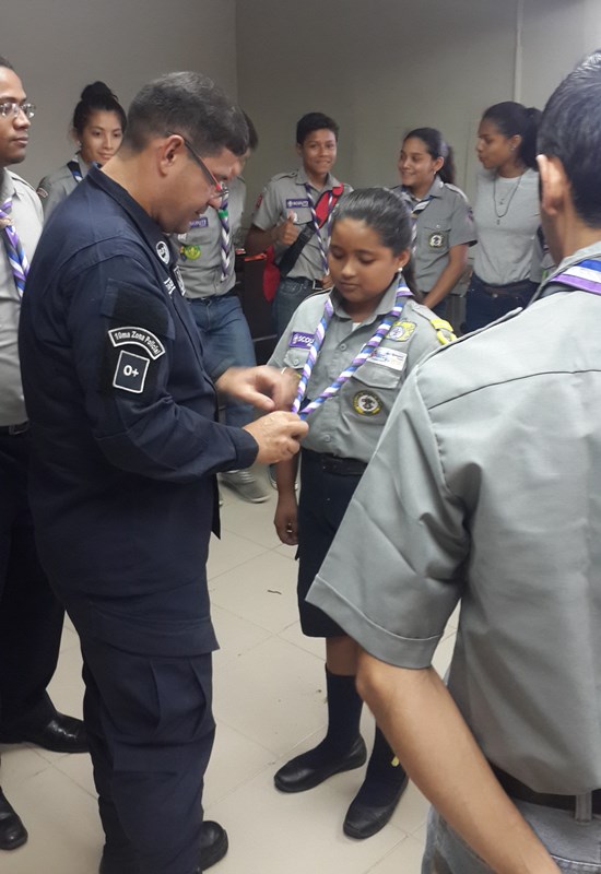 En un significativo acto, este sábado 9 de mayo se realizó la entrega de pañoletas por parte de la Zona de Policía de Panamá Oeste a miembros del Grupo Scouts #16, adscritos como parte de los programas preventivos de la zona. Esta entrega fue realizada en las instalaciones de la sede policial en La Chorrera por parte del comisionado Nadim García, quien le entregó las pañoletas a la licenciada Cristina Solano, directora del Grupo Scouts y Edwin Ayarza, Jefe de las diferentes secciones; estos a su vez las distribuyeron entre los nuevos integrantes como parte esencial y característica de los scouts. El propio comisionado García, recibió su pañoleta uniéndose como miembro del Grupo #16 de los Scouts. |