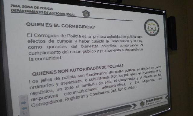La 7ma Zona Policial realiza conversatorio con los corregidores de la provincia de la provincia de Los Santos, tratando temas sobre aspecto legal, procedimientos, seguridad ciudadana y otros. Participan de esta actividad el Comisionado Franck Pinilla, Jefe de la Zona; Capitán Carlos García, Jefe del Departamento de Seguridad Ciudadana; Subteniente Rolando Moreno, Jefe del Departamento de Planeamiento, Licenciado Gustavo De Arco, Asesor Legal de la Zona. Iniciando el día de hoy con la participación de los Distritos de La Villa y Macaracas, posteriormente los demás distritos. |