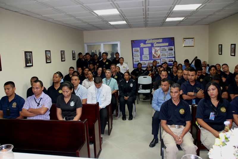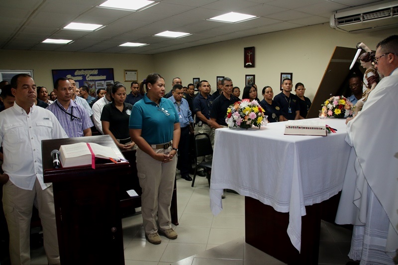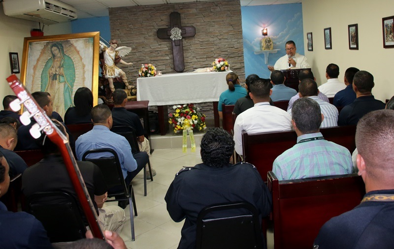 “Una fe firme en el auxilio de Dios”, unió a los uniformados y personal no juramentado de la Dirección Nacional de Inteligencia Policial y de la Dirección Nacional de Asesoría Legal de la Policía Nacional, durante la Eucaristía que se celebró este jueves 6 de agosto en la Capilla de San Miguel Arcángel de la sede ubicada en el corregimiento de Ancón. Durante la ceremonia religiosa, dieron gracias al “Todo Poderoso” por las bendiciones recibidas, a la vez que le pidieron su guía y sabiduría para continuar la tarea de “Proteger y Servir” a la comunidad. Para los que trabajan en la Dirección de Asesoría Legal, esta misa de gracias marca el inició de las actividades en celebración del Día del Abogado el próximo 9 de agosto, por lo que también oraron por el fortalecimiento de esta importante dirección, brazo fundamental en el buen funcionamiento de la Policía Nacional. Y como ya es tradición, más temprano, se rezó el Santo Rosario, siendo parte de la devoción religiosa que caracteriza a la primera institución de seguridad. Ambas actividades fueron transmitidas a través de Radio María teniendo como mensaje central el crecimiento espiritual, la solidaridad y el respeto como parte importante de nuestras vidas. |
