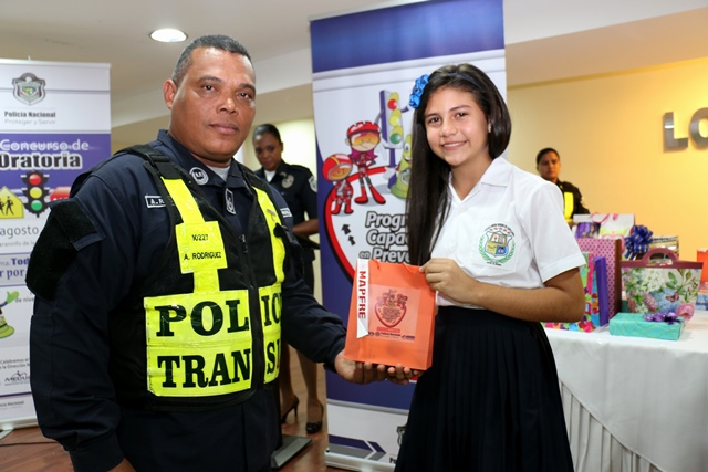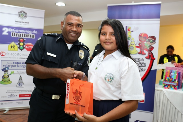 Como parte de la conmemoración de sus 46 años, la Dirección Nacional de Operaciones de Tránsito (DNOT) de la Policía Nacional, realizó el segundo concurso de oratoria bajo el lema “Todos debemos velar por la Seguridad Vial”. Este concurso de oratoria, hace énfasis en la preparación del ciudadano común en las regulaciones de tránsito y así evitar situaciones en un futuro. También busca ampliar la capacidad de comunicación, pensamiento, expresión de sentimientos de los niños, a través de estas actividades. Para Javier Fanuco, jefe de la DNOT, este evento busca acaparar la atención en los niños y sus padres. "Esto nos ayudará a fomentar el respeto a las leyes, normas vigentes del tránsito y prevención de los accidentes", destacó Fanuco. A todos los niños se les entregó un certificado y un obsequio, por la gran participación en este concurso. La niña Mitzui Barrios representando a la Provincia de Colón, ocupo el primer lugar de este concurso, la niña Reanys Acosta representante de la provincia de Chiriquí, ocupo el segundo mientras en el tercer lugar se dio un empate entre la provincia de Veraguas representada por el niño Jaime Perez y la niña Melanie Cantoral de Chorrera. Este es un evento muy importante para el director Omar Pinzón y cada uno de los miembros que integran esta institución de seguridad pública. Es un honor apoyar este tipo de iniciativa, y tengan la seguridad que seguiremos caminando a la par de la ciudadanía porque nuestra meta es tener más barrios seguros, con más oportunidades y manos firmes. |
