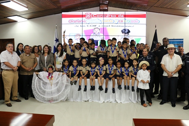 La sede de la Policía Nacional fue el escenario del tercer concurso InterCOIF (Centro de Orientación Infantil) realizado este año bajo el lema “Juventud Policial al Servicio de la Comunidad”, donde 25 niños representaron los COIF de las zonas policiales de Veraguas, La Chorrera, Chiriquí, Colón y Panamá. Los niños hicieron gala de su inteligencia, destreza y manejo escénico en este gran evento organizado por la institución policial, a través de la Dirección de Bienestar Familiar y Policial. Fueron 4 categorías (canto, coloreado, poesía y oratoria), las cuales fueron observados atentamente por el Director General de la Policía Nacional Omar Ariel Pinzón Marín, quien asombrado de tanto talento resaltó la importancia incentivar a la niñez panameña, en esta ocasión hijos de miembros de la institución, juramentados y no juramentados. “Es hermoso ver como estos niños y niñas, con fervor y muchas cualidades engalanan el escenario donde disertan con tanta emoción, sobre el tema Juventud Policial al Servicio de la Comunidad” dijo el jefe de la Institución. Los aplausos no se hicieron esperar ante cada presentación, los rostros de felicidad y orgullo de los padres era evidente. Entre los jurados estaban el reconocido compositor de música típica panameña, Sergio Cortez; la esposa del Director de esta Institución Policial, Nacelys de Pinzón; el Diseñador Gráfico y caricaturista Iván Rodríguez, entre otros. La elección de los ganadores por categoría fue difícil, quedando de primer lugar en coloreado, el representante de la provincia de Colón, José Martínez; mientras que canto se lo llevó Aviel Chiprí y el primer lugar en Poesía fue para la niña Alison Santos, ambos representantes de Panamá. La Provincia de Chiriquí, se quedó con la victoria en la categoría de Oratoria, con la representación del niño Kevin Ortega. Cada uno de los participantes se llevó medallas, trofeos y obsequios, entregados por el Director de la Policía Nacional Omar Pinzón, Miembros del Directorio y jefes de Zonas. |