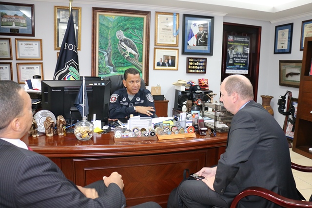 En la sede de la Policía Nacional, ubicada en Ancón tuvimos la grata visita del honorable señor Alexis Muñoz Cerpa, subdirector para la coordinación de la Oficinas Centrales Nacionales de las Américas (OCN) y Martin Raby, jefe de Protocolo y Ceremonial de la OCN, en una misión oficial de la Secretaría General de INTERPOL. Ambos, fueron recibidos por el Director (encargado) de la Policía Nacional, Javier Castillo, quien les dio la bienvenida en nombre del señor Director General Omar Ariel Pinzón Marín. El recibimiento se realizó en el despacho superior, allí intercambiaron algunos obsequios, e informaron acerca de los pormenores del desarrollo de la Conferencia Regional de las Américas, evento a desarrollarse en julio de 2016, en Panamá. Cabe señalar que Ambos funcionarios arribaron a Panamá el día 27 de septiembre desde Ámsterdam, en el aeropuerto internacional de Tocumen y fueron recibidos por una delegación de la Oficina Nacional de INTERPOL en Panamá, y acompañados por la capitana Gloria Silva durante su visita en suelo panameño. |