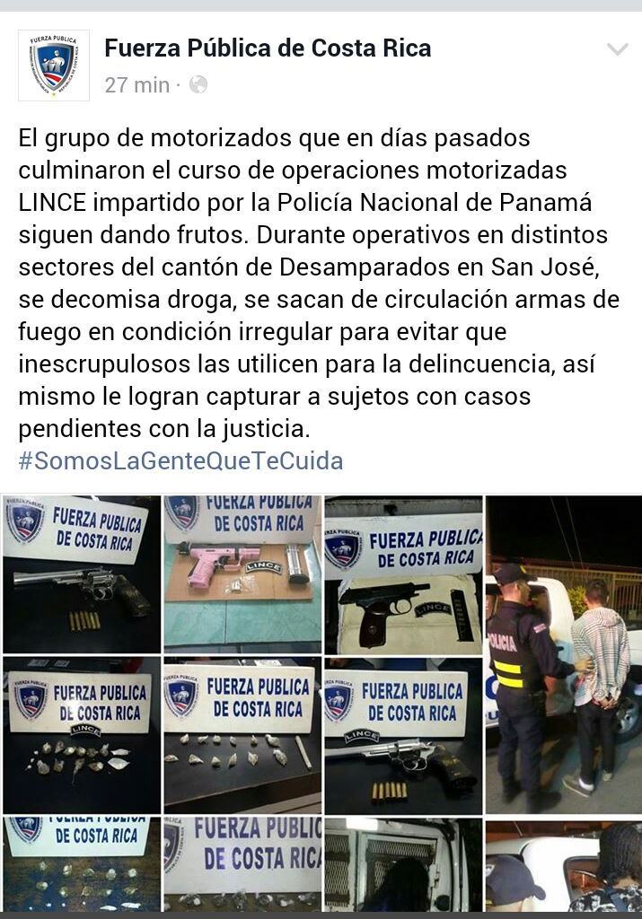 La capacitación dictada por espacio de cuatro meses por las unidades del Servicio Policial Motorizado (Linces) de la Policía Nacional a nuestros hermanos de la Fuerza Pública de Costa Rica, ha rendido grandes frutos en ese país. La Fuerza Pública de Costa Rica resaltó a través de las redes sociales que gracias a la instrucción de nuestras unidades, se han logrado acciones destacadas como decomiso de drogas, armas y aprehensión de delincuentes, entre otras. Nuestros motorizados dictaron de mayo a agosto de este año, el curso “Operaciones Policiales Motorizadas” transmitiendo así las experiencias que han adquirido en su labor diaria en las calles panameñas. Tras culminar favorablemente esta capacitación, las autoridades de Costa Rica reconocieron la labor de los instructores del Servicio Policial Motorizado de Panamá, por su aporte, enseñanzas y tácticas para combatir la delincuencia a través de esta unidad. |