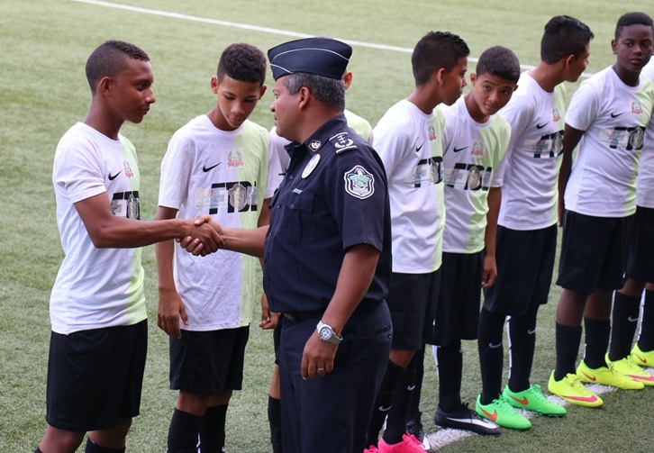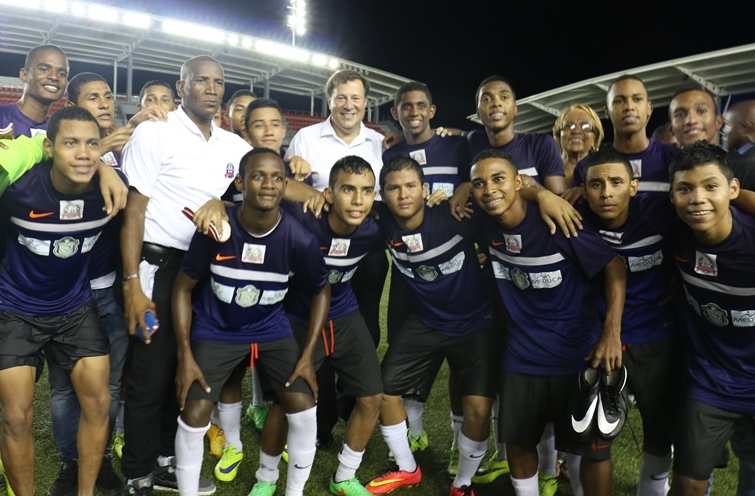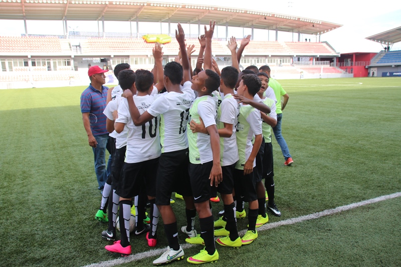 El colegio Abel Bravo y el Instituto Profesional y Técnico de Tocumen se alzaron con el tercer lugar en las categorías Sub-18 y Sub-15, respectivamente, en el gran Torneo Intercolegial de fútbol “Copa Presidente de la República 2015” este jueves 15 de octubre, realizado en el Estadio Maracaná. En este evento deportivo estaban presentes el Presidente de la República, Juan Carlos Varela Rodríguez y el Director General de la Policía Nacional, Omar Ariel Pinzón, quienes consideraron el torneo como histórico, que dará la oportunidad para conocer nuevos valores. El Presidente de la República, Juan Carlos Varela dijo sentirse orgulloso de los jóvenes que participan en este evento deportivo que da un prestigio a nuestro fútbol y brinda la oportunidad de compartir y demostrar que si hay talento. En tanto, Omar Ariel Pinzón Marín Director General de la Policía Nacional resaltó la importancia de que los jóvenes le saquen provecho a este torneo. “Tenemos muchos talentos y esto es algo positivo para la sociedad, me alegra mucho esta actividad deportiva y aplaudo este tipo de eventos”, apuntó el jefe policial. El evento deportivo inició en horas de la tarde, entre los colegios IPT de Tocumen y el colegio Francisco Beckman categoría Sub 15, quienes se disputaron el “premio de consuelo”, donde el IPT de Tocumen ganó 3- 1. El delantero Carlos Alberto Rodríguez se convirtió en el campeón goleador, anotando los tres goles que llevaron al IPT de Tocumen a llevarse el tercer lugar. En tanto en la categoría sub 18, el colegio Abel Bravo venció en penales 5-4 sobre el Instituto América, y termina con el merecido tercer lugar en la Copa Presidente de la República. El medio campista del colegio ganador, Alexis Martínez agradeció a la Policía Nacional, al equipo, a sus profesores y compañeros por el apoyo brindado. “Esta victoria se la dedicamos a Dios, porque confiamos en él y en el trabajo en equipo” explicó emocionado el deportista. Todo está listo para la final de la “Copa Presidente de la República 2015” que será disputada entre los equipos del Colegio Artes y Oficio Vs Colegio Abel Bravo (Sub-15), en tanto, Escuela Profesional Isabel Herrera de Obaldía Vs Instituto Nacional (Sub-18). Puedes seguir los acontecimientos de esta Copa encuentro en nuestras redes sociales @protegeryservir y cuenta de Facebook.