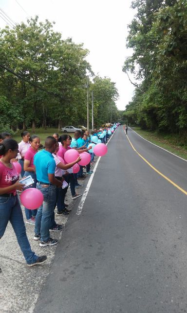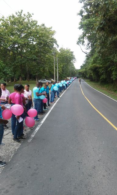 Con el propósito de hacer un llamado a la población para que se practiquen los exámenes a tiempo para la detección temprana del cáncer de mamas y de próstata, jóvenes aspirantes a agentes de Policía del Instituto Superior Policial, Presidente Belisario Porras (ISPOL), de la Policía Nacional, realizaron una cadena humana. Conmemorando el mes de la campaña de la Cinta Rosada y Celeste, unos 200 jóvenes aspirantes a agentes de Policía salieron vestidos con suéter rosado y celeste, y con globos del mismo color de la campaña. Los jóvenes se mantuvieron por espacio de 15 minutos, fuera de las instalaciones del Ispol para hacer un llamado a la ciudadanía de que acudan a sus médicos si observan alguna alerta que pueda cambiar sus vidas. Los futuros agentes entregaron folletos con temas alusivos a la prevención del cáncer que de acuerdo al Instituto Oncológico Nacional (ION), más de 27 mil 871 personas entre el 2003 y 2013 fueron diagnosticadas en este nosocomio con algún tipo de cáncer. El cáncer de mama entre las mujeres, se ubicó con mayor incidencia, totalizando 4 mil 863 casos, seguido del cáncer de próstata con 2 mil 969 casos.