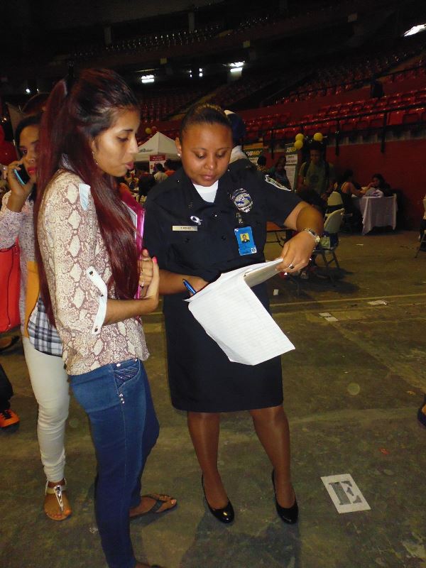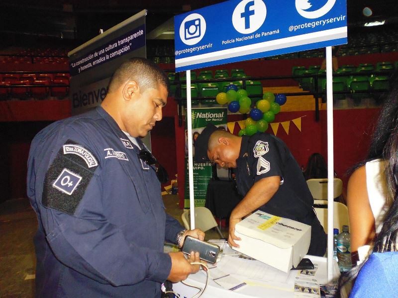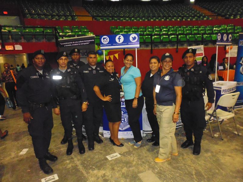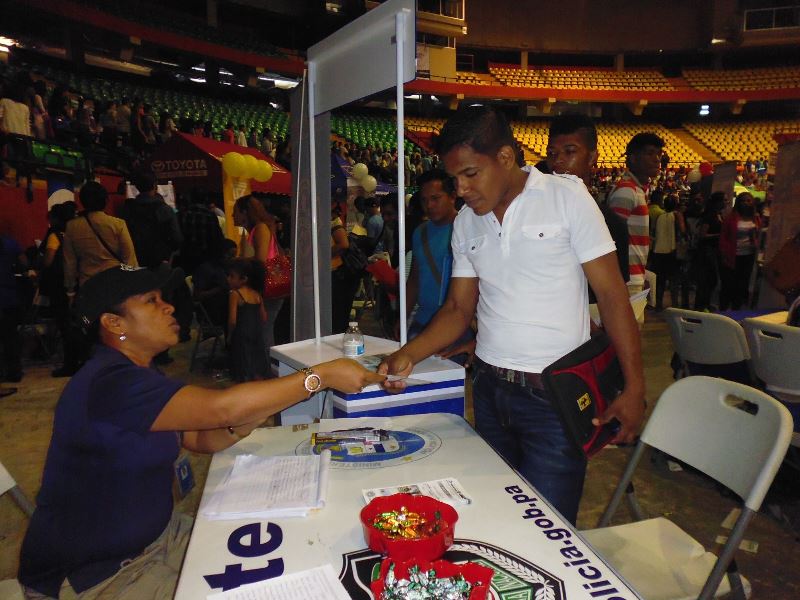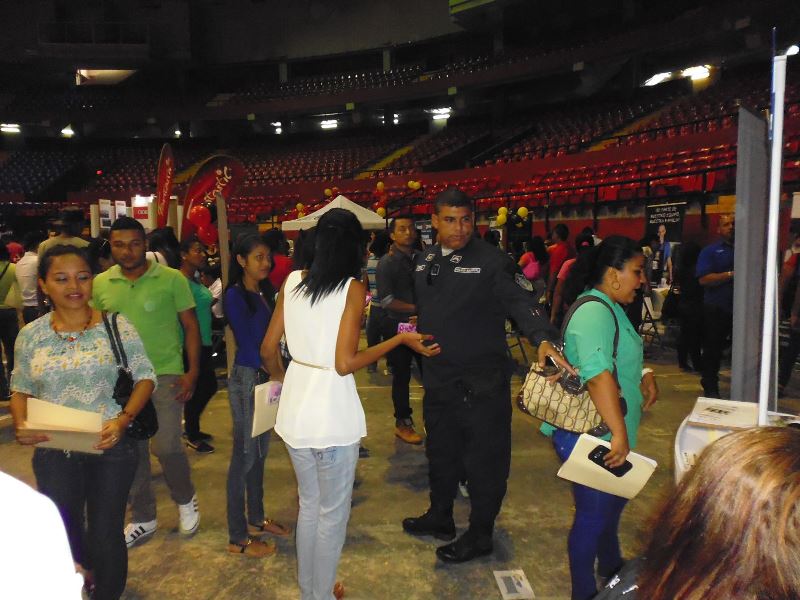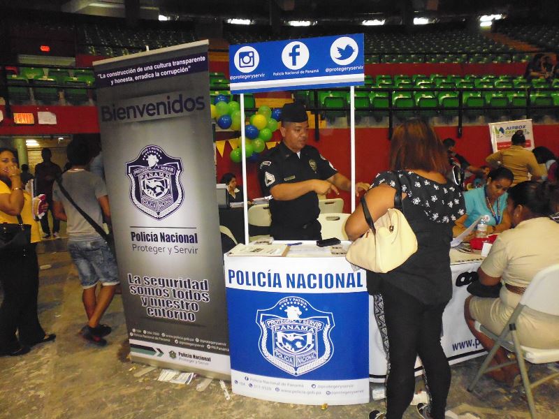 Muchos jóvenes con deseos de servir a la Patria se acercaron al stand de la Policía Nacional, durante la feria de trabajo organizada por el Ministerio de Trabajo y Desarrollo Laboral en la Arena Roberto Durán. A estos jóvenes se les brindó información sobre los requisitos de ingreso y las ofertas académicas que ofrece la Policía Nacional a través del Instituto Superior Policial (ISPOL) y de la Escuela de Oficiales (ESOPOL). Igualmente, los uniformados entregaron a los presentes volantes con información sobre la página web de la institución de seguridad, sus redes sociales y programas de prevención. En esta mega feria de empleo se ofertaron 12 mil vacantes en diversas actividades económicas con el apoyo de 130 empresas e instituciones gubernamentales.