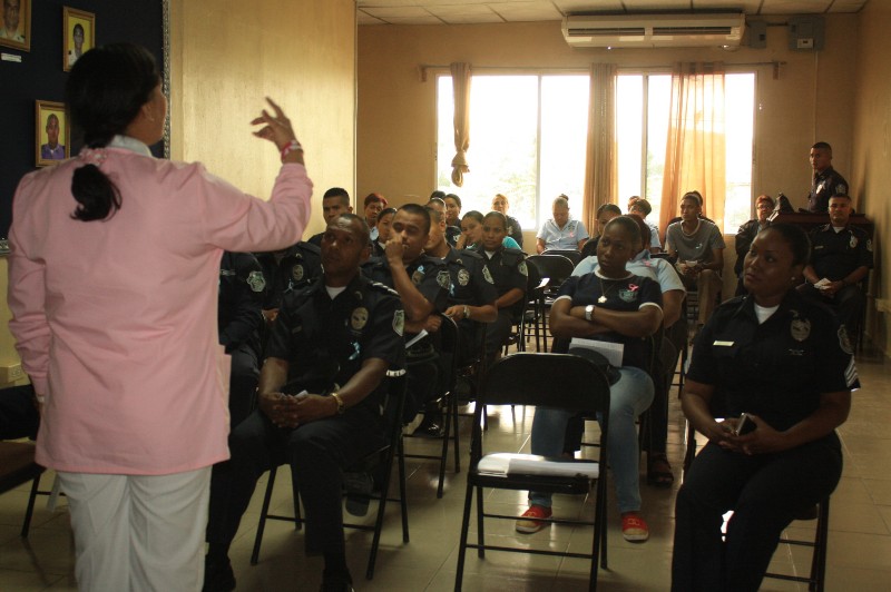 Un aproximado de 25 unidades policiales de la 2da. Región recibieron charlas de prevención contra el cáncer de mama y próstata en la sede de Santa Marta, distrito de San Miguelito. La enfermera maría Elena Goicochea de servicios médicos de la Policía Nacional dictó dicha charla, relacionada a la detención temprana del cáncer de mama y próstata. Los uniformados pudieron conocer los factores del riesgo, los signos y síntomas de esta terrible enfermedad, recordando que la detención temprana hace la diferencia entre la vida y la muerte. |