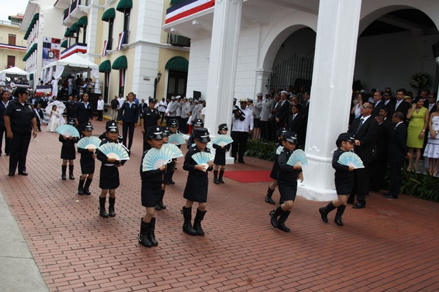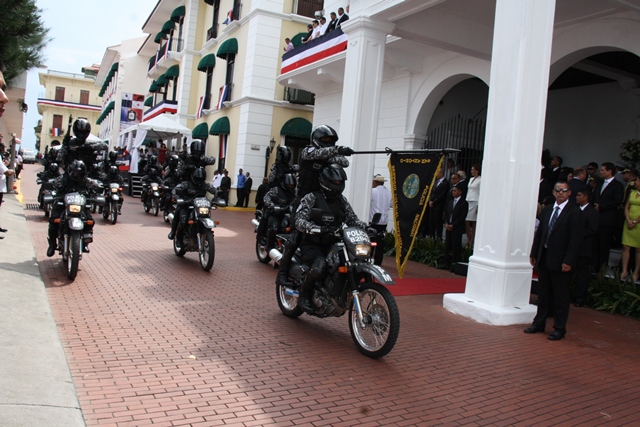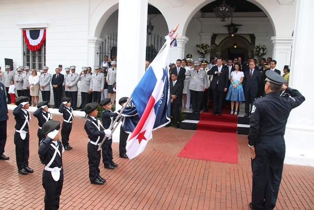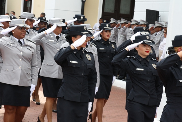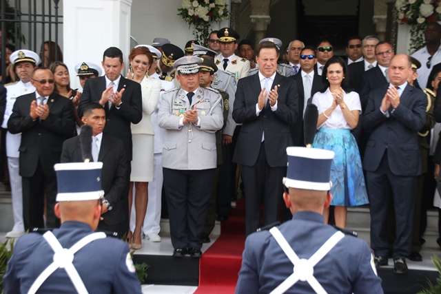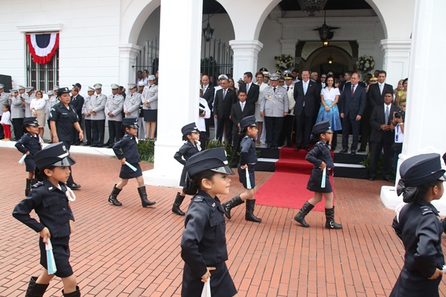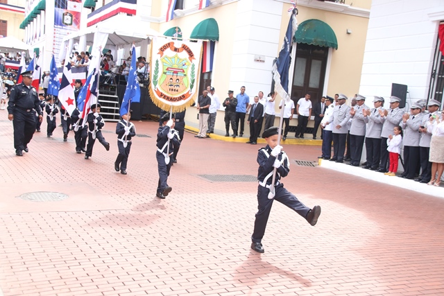 Con una lucida delegación conformada por 500 unidades y oficiales de la Policía Nacional de Panamá, se rindió honor este 3 y 4 de noviembre, dando inicio a la celebración de las festividades patrias. El martes 3 de noviembre, en celebración de los 112 años de la separación de Panamá de Colombia la familia de uniformados engalanaron las calles del Casco Antiguo, con una delegación que mostró su fervor patriótico. El Director General de la institución policial, Omar Ariel Pinzón Marín junto a un cadete de la Escuela de Oficiales Doctor Justo Arosemena, entregó al excelentísimo Presidente de la República, Juan Carlos Varela Rodríguez, en el palco presidencial, una Daga de cadete que simboliza el honor, valor, coraje y respeto hacia la Institucionalidad de cadete. Mientras que para el 4 de noviembre, día alusivo a Los Símbolos Patrios, la delegación de la Policía Nacional vistió con traje de gala. La representación de la primera institución de seguridad del país, fueron recibidos y aplaudidos por el Presidente de la Republica, Juan Carlos Varela, su esposa Lorena Castillo de Varela, el ministro de Seguridad Pública Rodolfo Aguilera, el director de la Policía Nacional Omar Ariel Pinzón Marín acompañado de su esposa Nacelys de Pinzón y Ministros del Gabinete. El desfile contó con la presentación de grupos de servicios especiales, además con representaciones de niños y niñas de los Centros de Orientación Infantil, de la Policía Nacional que con su alegría y dinamismo se robaron aplausos y sonrisas a los presentes. Mientras que el donaire de la mujer policía, fue visto en su esplendor en las damas del batallón Femenino, quienes por primera vez se integra a la delegación policial. 48 unidades cada una portando sus respetivos banderines resaltando las Direcciones, Zonas y Dependencias que conforman esta Institución Policial. La Banda de Música de la Policía Nacional deleitó a los asistentes con las diferentes notas musicales alusivas a la patria. 130 cadetes de la Escuela de Oficiales de Policía, Dr. Justo Arosemena, ubicada en el antiguo Fuerte Davis, provincia de Colón también desfilaron. Dentro de la delegación de la Policía Nacional, participaron también 24 cadetes de la Escuela de Oficiales Alférez Mariano Santos de la Policía Nacional de Perú, que actualmente realizan su pasantía en la Escuela de Oficiales de Panamá. Diversos estamentos de seguridad e instituciones del estado, y escuelas públicas y privadas con sus relucidas delegaciones recorrieron las dos rutas de estos desfiles. |