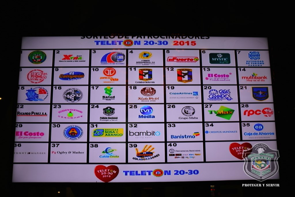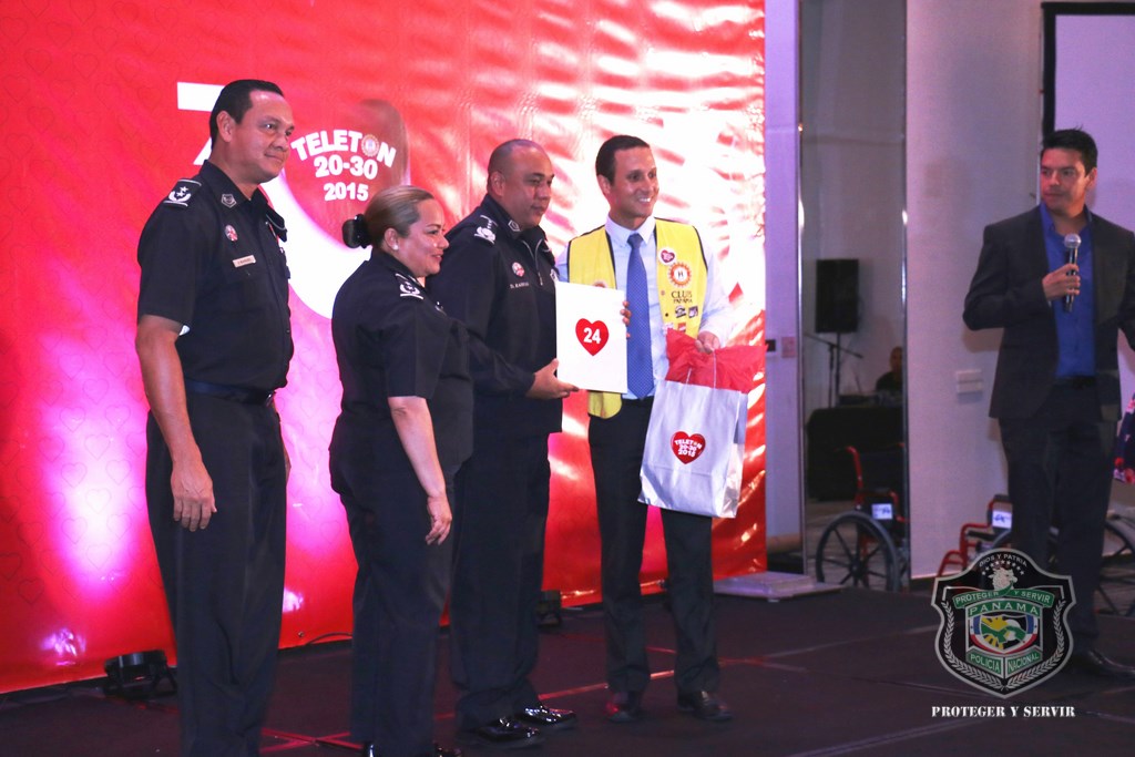 Este 12 y 13 de diciembre la Policía Nacional dice presente en la Teletón que anualmente realiza el Club Activo 20-30 de Panamá, este año ocupamos el puesto número 24 durante el tradicional sorteo de patrocinadores que define el orden de participación en este evento. Un promedio de 40 empresas, entre la que destaca la primera institución de seguridad de nuestro país, reafirmaron su compromiso de apoyo a esta noble causa. Correspondió al Subdirector Penitenciario David Ramos Villa y a la Comisionada Elida Ortega, representar a la Policía Nacional de Panamá durante el desarrollo de este importante sorteo. Con sus aportes los más de 18 mil miembros de la Policía Nacional, apoyan el Proyecto Meta 2015 al destinar fondos para el diseño, equipamiento y construcción de seis centros de rehabilitación y salud a nivel nacional. La actividad se vio reforzada con la presencia de Roy Ariel de Jesús, Niño Símbolo de la Teletón 2015, quien invitó a los participantes presentes y al público en general para que apoyen esta noble causa. En tanto el Presidente de la Teletón 2015, Raúl Vallarino, agradeció a los patrocinadores su decidida participación y apoyo a esta actividad que desarrollará el Proyecto Meta a través de la Teletón 2015.