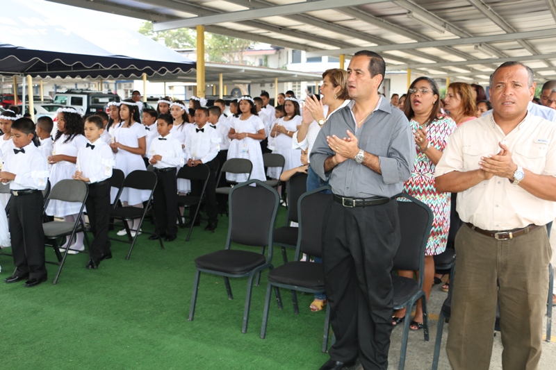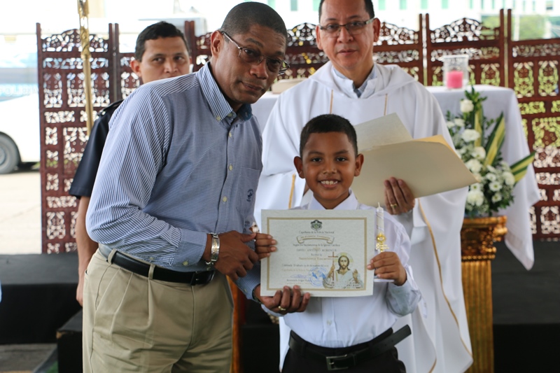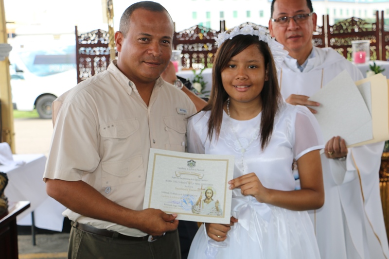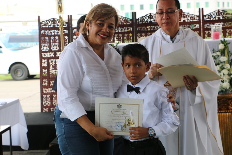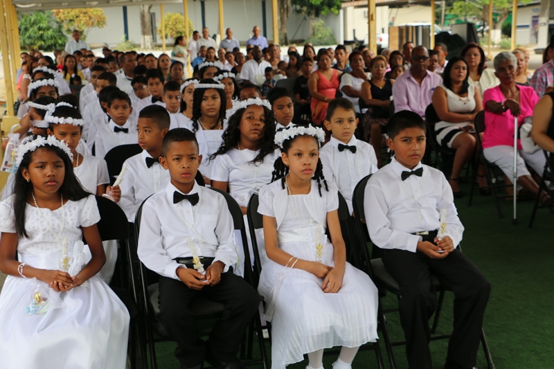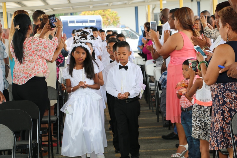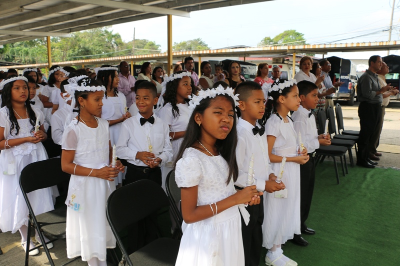 La Primera Comunión es una etapa importante en la vida de todo niño, de eso estamos seguro en la Policía Nacional, por ello organizamos un ceremonia donde participaron treinta niños entre ellos hijos y familiares de miembros de la Institución Policial. Esta ceremonia donde los niños recibieron el Sacramento de la Eucaristía transformado en pan (hostia) y en vino, símbolos que remiten al cuerpo y la sangre de Cristo, fue presidida por el padre Edgar Flores, capellán de la Policía Nacional en Ancón. En su mensaje el Capellán Flores, dijo que el sacramento de la primera comunión es uno de los tres considerados como de iniciación en la vida cristiana. En este acto estaban presentes la Comisionada Oris Jaén, jefa del Dirección de Gestión y Proyectos; el Comisionado José Castillo, jefe de la Dirección de Recursos Humanos; el Comisionado Juan Cerezo jefe de la Dirección de Ingeniería e Infraestructura, quienes felicitaron a estos niños, por esta decisión tan importante que los llevará por los caminos del señor. En estos sacramentos se exterioriza la entrega y devoción de los católicos hacia Dios, ser sus hijos, y a su lado tener vida eterna, y la primera comunión representa un paso más en el compromiso religioso del niño, en su vida cristiana.