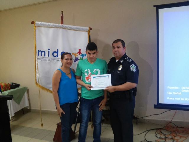 Unidades de la Zona de Policía Nacional de Herrera se hizo presente en la primera graduación del programa de auto ayuda dirigido a jóvenes y familias en riesgo social, organizado por el Ministerio de desarrollo Social en la provincia de Herrera. El acto fue realizado en el salón de conferencia del Hotel Versalles, de la Ciudad de Chitré, donde unas 30 personas recibieron certificados otorgado por el Mides de Chitré. La graduación contó con la participación del Comisionado Ismael Herrera, jefe de la Zona de Policía de Herrera invitado especial. En el lugar estuvieron presente facilitadores del programa y funcionario del Mides. |