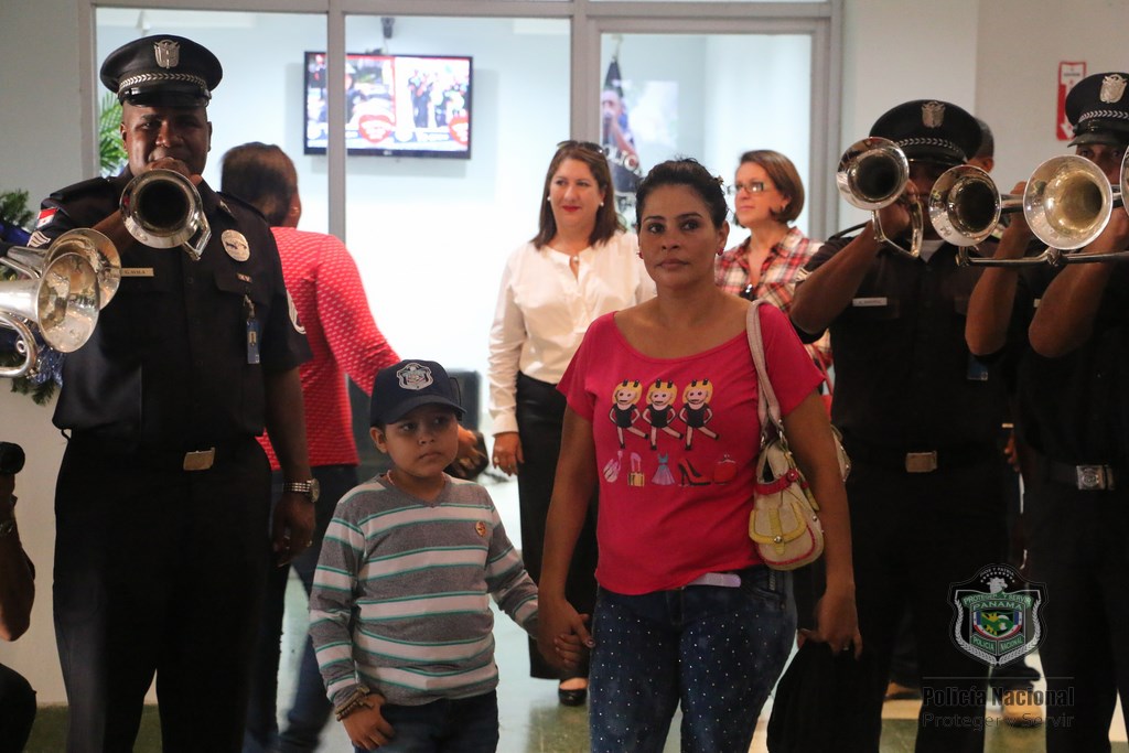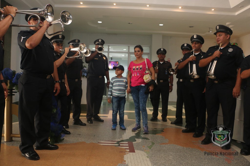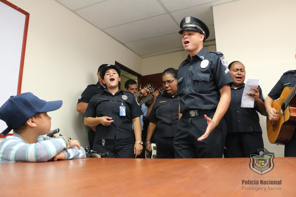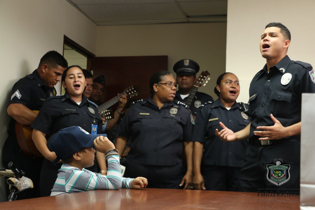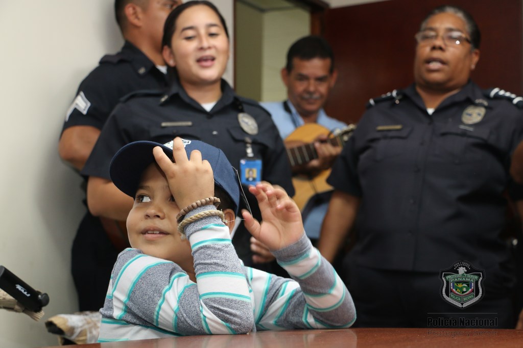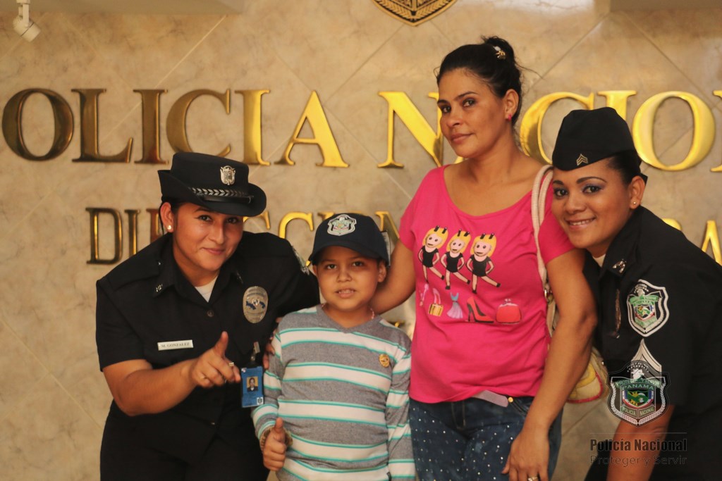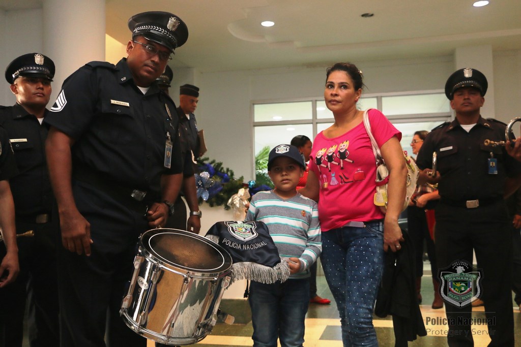 Recibimos con alegría al niño Martin Quintero de la Fundación Amigos del Niño con Leucemia y Cáncer (FANLYC) junto a su madre, en las instalaciones de la Policía Nacional en Ancón. El niño quien sueña con ser vaquero de día y Policía de noche, fue atendido por las unidades del Departamento de Seguridad Ciudadana a cargo del comisionado Rafael Álvarez. Fue recibido con Villancicos por parte del grupo voces y cuerdas de la Policía Nacional y la Banda de música de la institución. Santana Cruz madre de Martín, se mostró complacida por esta iniciativa ya que logra distraer y olvidar por lo que está pasando, haciéndolo más fuerte ante lo que se enfrenta todos los días por la enfermedad que padece. Martín agradeció a las unidades policiales con una gran sonrisa en su rostro, mientras que los uniformados le entregaron obsequios.