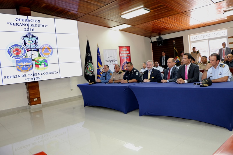 Con un despliegue del pie de fuerza, los estamentos de seguridad y demás instituciones de emergencia que conforman la “Fuerza Tarea Conjunta” (FTC) iniciaron este lunes 28 de diciembre el operativo de prevención y vigilancia denominada “Tritón” que garantizará un verano, Carnavales y Semana Santa seguras. En este operativo participarán más de 28 mil miembros de las diferentes instituciones que componen la FTC, que estarán brindando seguridad en los diferentes puntos del país. La FTC estará integrado por la Policía Nacional, Servicio Nacional Aeronaval (SENAN), Servicio Nacional de Fronteras (SENAFRONT), Servicio de Protección Institucional (SPI), Benemérito Cuerpo de Bomberos de la República de Panamá (BCBRP) y Sistema Nacional de Protección Civil (SINAPROC). El Ministro de Seguridad Pública, Rodolfo Aguilera Franceschi agradeció a todos los agentes de estamentos, unidades del Sinaproc y CBP por el esfuerzo que harán en el verano y pidió a la ciudadanía poner de su parte y seguir las reglas e indicaciones de las autoridades. Por su parte, el Director General de la Policía Nacional, Omar Ariel Pinzón Marín expresó que la misión de los estamentos de seguridad es salvaguardar la seguridad de todos los ciudadanos. "Estamos aquí reunidos para realizar el trabaja en equipo y reactivar la fuerza de tarea conjunta con el afán de desplegarnos por mar, aire y tierra, garantizando la integridad física de nacionales y extranjeros" destacó el jefe policial. En tanto, el Subdirector Nacional de Operaciones Comisionado Domingo Espitia dijo que el desplazamiento de las personas a diversos puntos del país estará supervisado por unidades de la Dirección Nacional de Operaciones del tránsito desplegados en las principales vías. puntualizó Este operativo se lleva a cabo debido a que a partir de enero de 2016, inicia la temporada seca, lo que produce un aumento de la concurrencia de los nacionales y extranjeros que visitan las diferentes playas, ríos, balnearios y ferias nacionales. Igualmente, del 5 al 10 de febrero que se celebran los Carnavales en todo el territorio nacional, las unidades estarán en las calles, lugares donde se celebran estas fiestas y principales calles del país brindando seguridad a nacionales y extranjeros. Lo mismo ocurrirá con la Semana Santa que se celebrará del 21 al 27 de marzo, debido al incremento de feligreses en las iglesias y otros sitios donde se realizarán actos religiosos; lo que concentra gran cantidad de personas. En tanto, como fuerzas amigas estarán: Al operativo de tarea conjunta asistieron el Ministro de Seguridad Pública, Rodolfo Aguilera, Ministro de Gobierno Miltón Henríquez, el Viceministro de Seguridad Pública, Rogelio Donadío, el Director General de la Policía Nacional, Omar Ariel Pinzón Marín, además de los directores de los otros estamentos de seguridad, miembros del Directorio Policial entre otras personalidades.