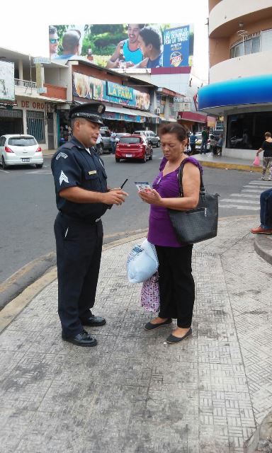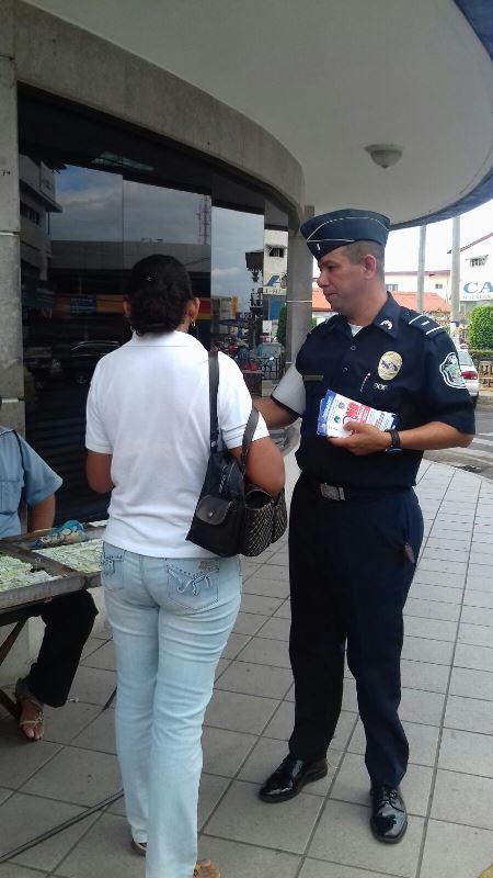 Unidades administrativa de la Zona de Policía de Herrera realizaron una jornada de volanteo en diferentes centros comerciales de la provincia de Herrera, en la que conversaron con residentes del área, como parte del acercamiento que llevan a cabo. Se entregaron cientos de volantes con números telefónicos a los que acudir de necesitar apoyo policial, además de medidas de seguridad y recomendaciones. Algunas de las recomendaciones, era tener cuidado cuando se trasladan a realizar compras e igualmente para las personas que venden billetes de loterías, estar atentos de su seguridad. También en la interacción de los miembros del orden público se aprovechó el momento para entregarle volantes con requisitos a los jóvenes que transitaban por el lugar, invitándolos a ingresar a las filas de la Policía Nacional. |