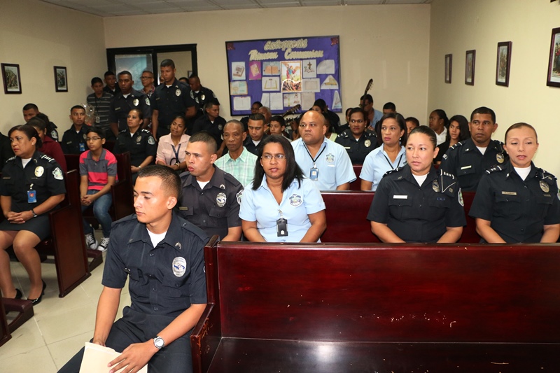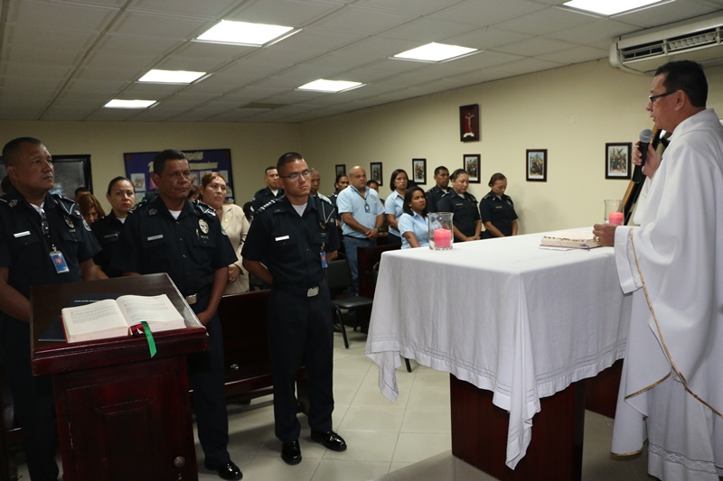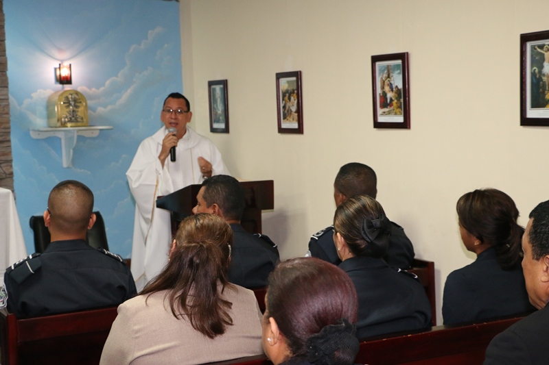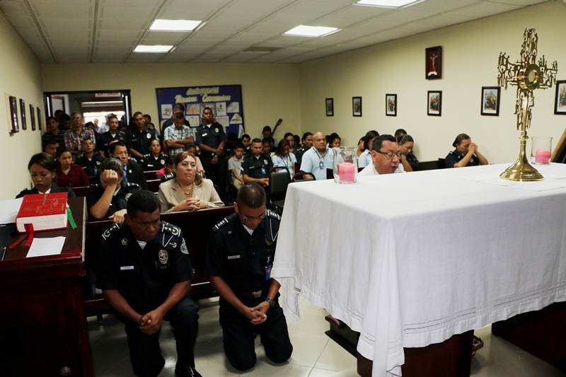 Uniformados y miembros no juramentados de la Dirección General de la Policía Nacional participaron de la primera Eucaristía, que se celebra este año en la sede ubicada en el corregimiento de Ancón. Con esta ceremonia que inició con el Santo Rosario y fue presidida por el padre Edgar Flores, se inicia en la institución un nuevo año, fortalecidos en la fe de Dios, y en la que se pidió al Todo Poderoso salud y sabiduría en la toma de decisiones ante situaciones que enfrentamos en nuestra vida diaria. “Cada inicio de año es para la humanidad como una puerta nueva que se abre, tras la cual nos esperan nuevos retos que debemos superar”, fue parte del mensaje central de esta Eucaristía, transmitida a nivel nacional a través de Radio María. Le correspondió al Secretario General y comisionado Cristóbal Rivera, en representación del Director General, Omar Ariel Pinzón Marín ofrecer este mensaje. “Para los panameños, y en particular para los integrantes de la Policía Nacional, es un momento oportuno para renovar las oraciones al Creador, pidiéndole perdón por nuestras fallas e implorando que nos ofrezca su iluminadora bendición, y con ella la energía y el conocimiento para cumplir nuestras funciones en bien de la sociedad”, dijo Rivera.