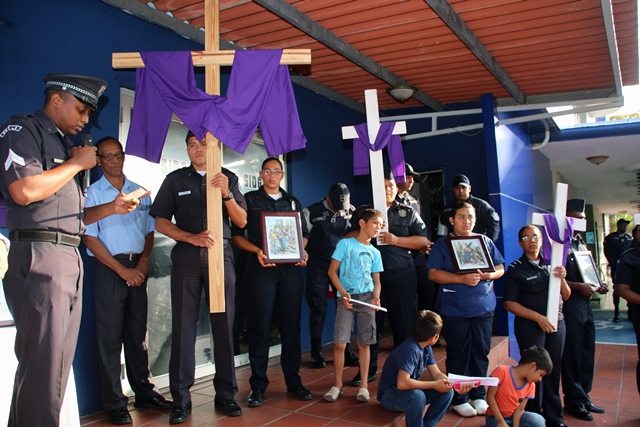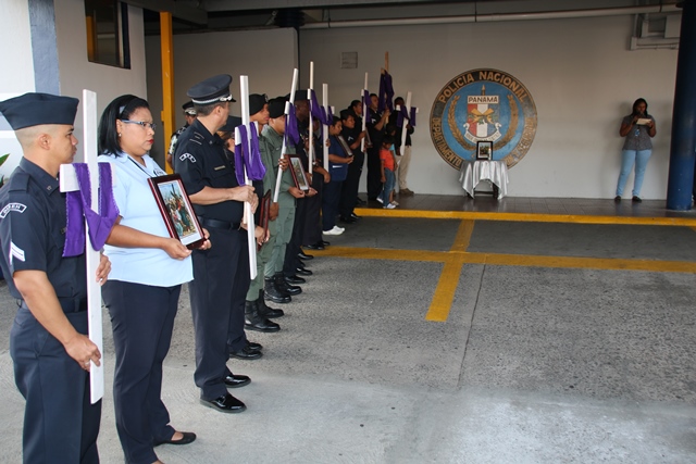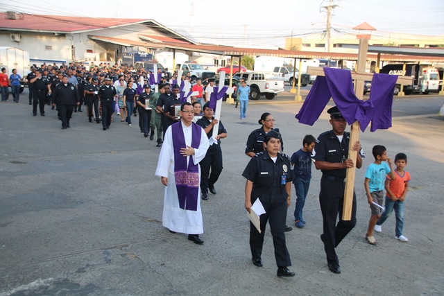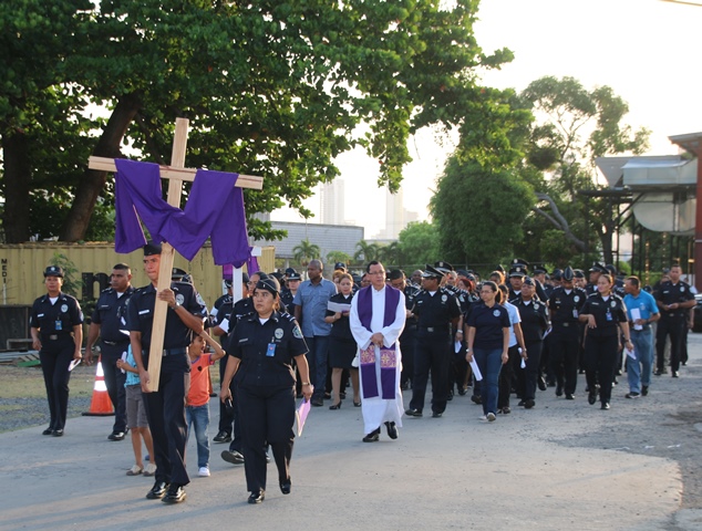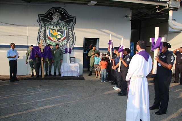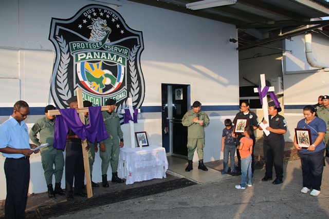 Las mujeres y hombres de uniforme cumplieron con el segundo momento de Vía Crucis, este viernes 26 de febrero, planeado en conmemoración de la Semana Mayor, realizado en la sede de la Policía Nacional, ubicada en el corregimiento de Ancón. Por segunda ocasión, la familia policial devota y comprometida con Dios, recorrió las 15 estaciones ubicadas en diversos puntos de la sede policial. Ésta es una actividad de carácter religiosa que refuerza el valor del sacrificio, ejemplo de Jesucristo en su lucha por superar las dificultades que se le presentaron a lo largo de sus 33 años de vida en la tierra, y al momento de alcanzar su objetivo cumbre: el de redimir a toda la humanidad de sus pecados, cargando con una pesada cruz hasta el Gólgota. Cada una de las estaciones destaca el recorrido que hiciera Jesús de camino hacia ese lugar de su crucifixión y muerte. En la actividad estuvo presente miembros del Directorio, unidades policiales y miembros no juramentados que laboran en la primera institución de seguridad pública de Panamá. En el Vía Crucis se medita en los momentos y sufrimientos vividos por Jesús, y se elevan oraciones teniendo en mente no volver a cometer actos que vayan en contra de la voluntad de Dios, escrita en su Santa Palabra. |