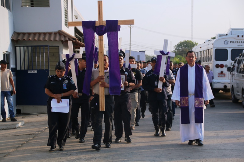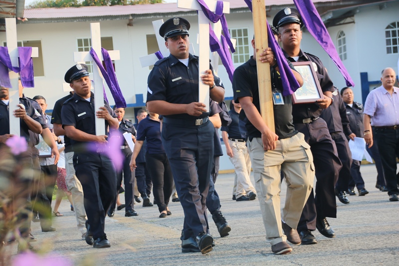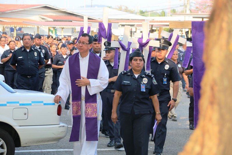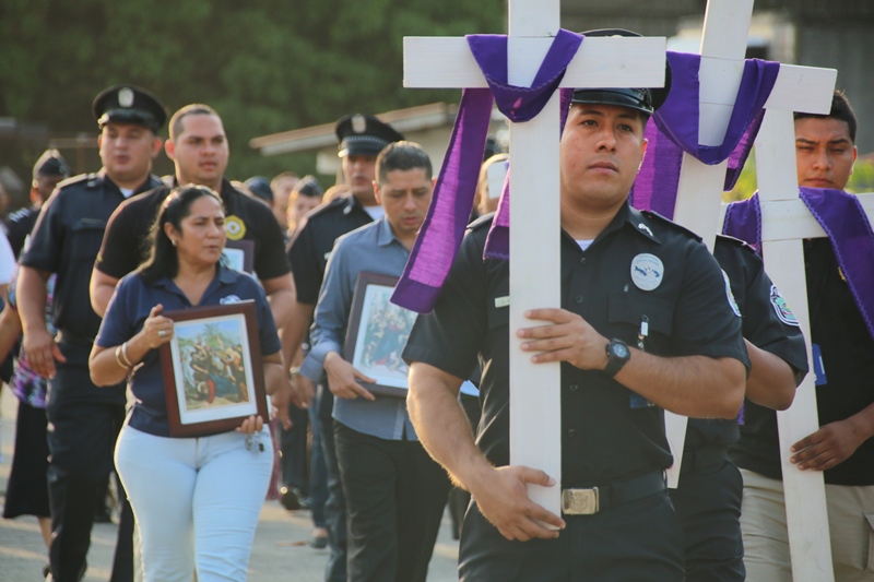 Este viernes 4 de marzo en horas de la mañana, se llevó a cabo el acto del viacrucis, dirigido por el capellán de la Policía Nacional el padre Edgar flores junto a miembros de direcciones de la institución. El viacrucis tiene 15 estaciones cada una de ellas tenía una dirección encargada ; tales como la Banda de Música, Asesoría Legal ,Inspectoría General , Dirección Nacional de Operaciones, Auditoria Interna, Junta Superior, D.I.P, Comedor , Explosivos, Ingeniera e Infraestructura , G.A.S , Probipo, Sistema Penal Acusatorio, Protocolo y Docencia . Un viacrucis o vía crucis (en latín: «camino de la cruz») se refiere a las diferentes etapas o momentos vividos por Jesús desde el momento en que fue aprehendido hasta su crucifixión y sepultura. |