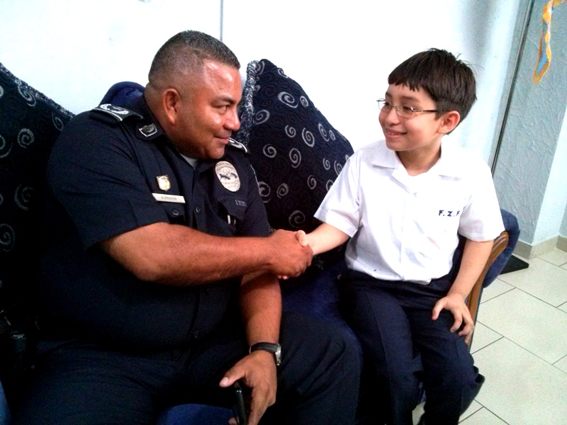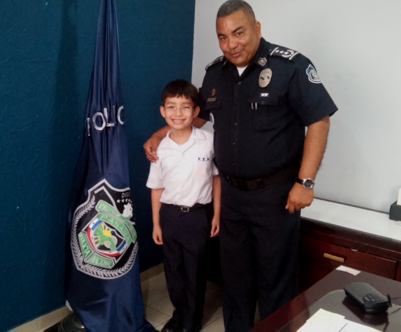 Arturo Alejandro Cedeño del Cid, niño seleccionado de la provincia de Coclé, para hacer realidad su sueño ser "Policía por un día" fue recibido por la jefatura de la Segunda Zona Policial, dirigida por el Comisionado Aníbal Prados. Este jovencito estudiante del Centro Educativo Federico Zúñiga Filiú representará al comisionado Aníbal Prados en los actos que tendrán lugar en la sede del edificio de la Administración en la ciudad capital. Arturo Alejandro de 9 años de edad, visiblemente emocionado dijo que este era uno de sus sueños, ser policía y así ayudar a las personas cuando se les presentaba algún problema. El comisionado Aníbal Prados lo felicitó por ser un niño aplicado y lo exhorto para que continúe con ese ímpetu emprendedor que tiene. |