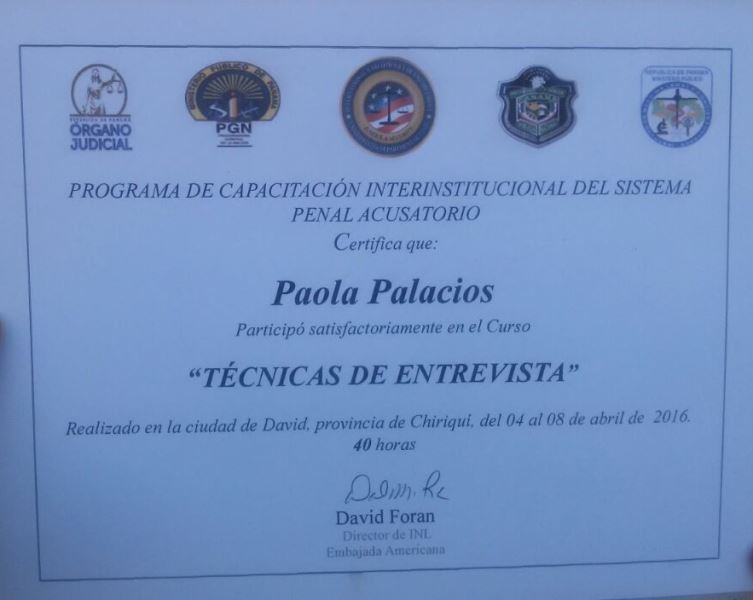Un seminario de 40 horas se dictó en las instalaciones de la 4ta. Zona Policial de Chiriquí, durante toda la semana, auspiciado por la Embajada del Gobierno de los Estados Unidos y organizado por la Dirección de Investigación Policial de la Policía Nacional. Unas 26 personas participaron, entre ellos unidades de la Subdirección de Inteligencia Policial, Subdirección de Investigación Judicial, además funcionarios del Ministerio Público, del Órgano Judicial, del Instituto de Medicina Legal y Ciencias Forenses y defensores de oficio. Fueron tratados varios temas inherentes al Sistema Penal Acusatorio, principalmente el de “Técnicas de Entrevistas”. El Magister Víctor Velásquez, de nacionalidad colombiana, fue el expositor extranjero invitado, mientras que por Panamá los ponentes fueron los Fiscales David Frías y Efraín Jaén, ambos funcionarios de las provincias centrales.