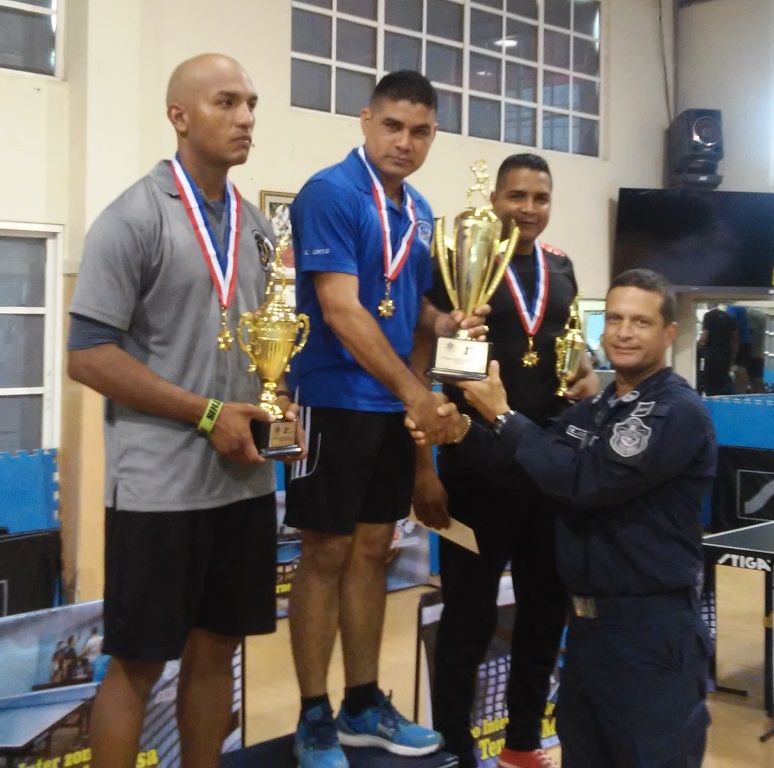 “Hemos cumplido con el reforzamiento físico, espiritual de las unidades que integran esta institución así como con el fortalecimiento institucional, baluarte indispensable para el buen desarrollo de las funciones dentro de la Policía Nacional de Panamá, destacó el Director General de la Policía Nacional Omar Ariel Pinzón Marín durante Segundo Torneo Interzona de Tenis de Mesa, llevado a cabo conmemorando el 79 aniversario del “Día del Policía” Agregó que estas disciplinas deportivas buscan fortalecer la mente y el espíritu de los policías así como la superación física y personal de cada uno de los individuos que participaron en algunos ejercicios propios de la faena policía diaria. “También se ha llevado a cabo la campaña “Dale Valor al Azul” útil para el fortalecimiento de nuestros principios y valores”, dijo Pinzón. En el Segundo Torneo Interzona de Tenis de Mesa en el cual participaron tres categorías: la primera de 18 a 29 años; la segunda entre 30 a 39 años y la tercera de 40 años y más. En la Categoría de los 18 a 29 años, el Agente del Grupo de Apoyo al Servicio (GAS) Malcom García, resultó ganador del primer puesto, en tanto el agente José Pierre también del Grupo de Apoyo al Servicio ocupó el segundo lugar. El aspirante Javier Aguilar del Instituto Superior Policial ocupó el tercer lugar en tanto el Cabo 2do. Ángel Castillo del Dirección Nacional del Servicio Policial Especial (Dinaspe) quedó en el cuarto lugar. En tanto el Teniente Carlos Ortiz de la Unidad de Policía Comunitaria (UPC) ganó el primer lugar en la categoría de 30 a los 39 años; el Teniente Germán Muñoz del Dinaspe, ocupó el segundo lugar y el Sargento Segundo Roberto Butcher Dirección de Bienestar Policial y Familiar (Dibipolf) ocupó el tercer lugar. Finalmente en la categoría de los 40 años o más, el Comisionado Gustavo Cogley ocupó el primer lugar; el Subteniente César Tapia de la (DIJ) ocupó el segundo lugar y el Tercer Lugar quedó compartido entre el Subteniente Artemio Moreno de la Canalera y el Sargento Segundo Ismael Smith de Telemática.