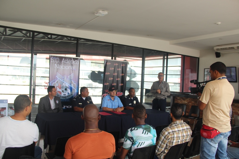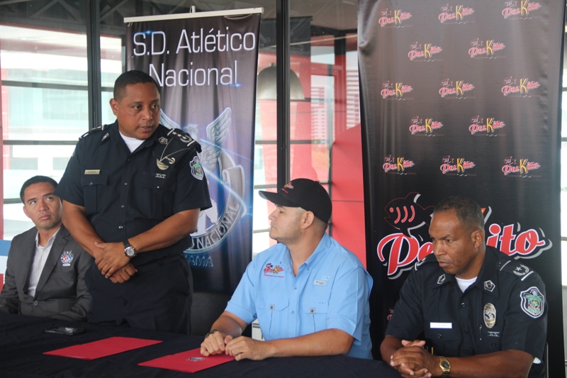El equipo Sociedad Deportiva Atlético Nacional de la Policía Nacional firmó este jueves 21 de abril un convenio de patrocinio con el Restaurante Peskito. Durante el acto estuvieron presentes en la mesa principal el comisionado René Moses Presidente de la Junta Directiva de la SD Atlético Nacional, Abdiel Celis propietario del Peskito, el Mayor Ibero Valdés Gerente Deportivo de la SD Atlético Nacional y el Director Técnico del equipo Atlético Nacional José Chiari quienes conversaron con los medios de comunicación presentes sobre el futuro del club. Jugadores estuvieron presentes para presenciar la firma del convenio. |