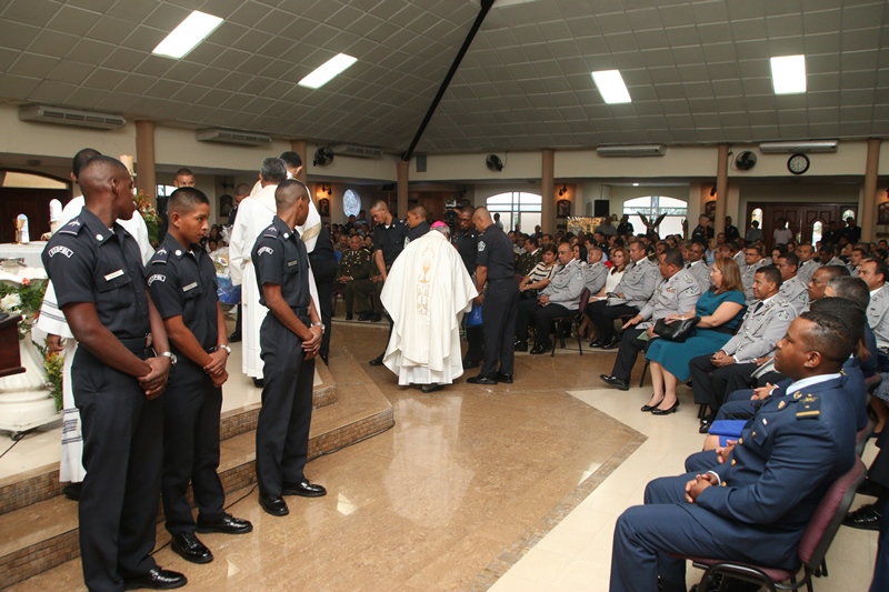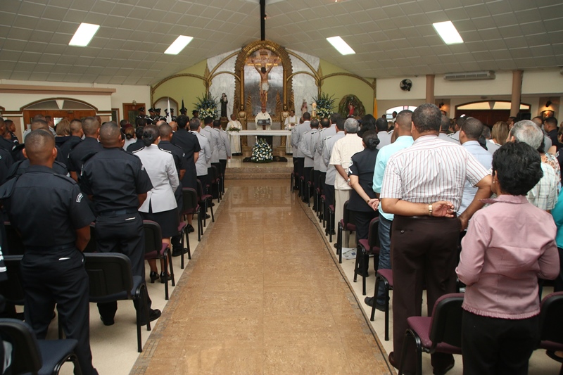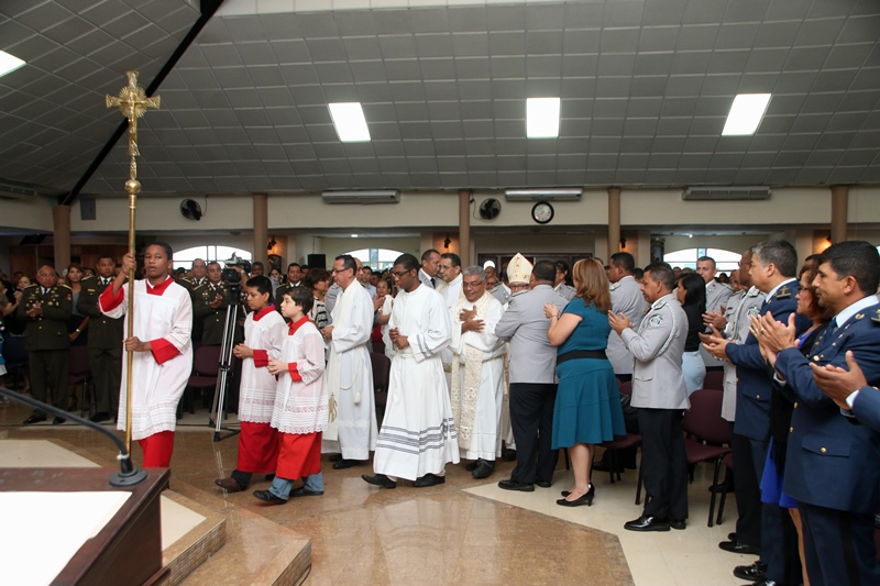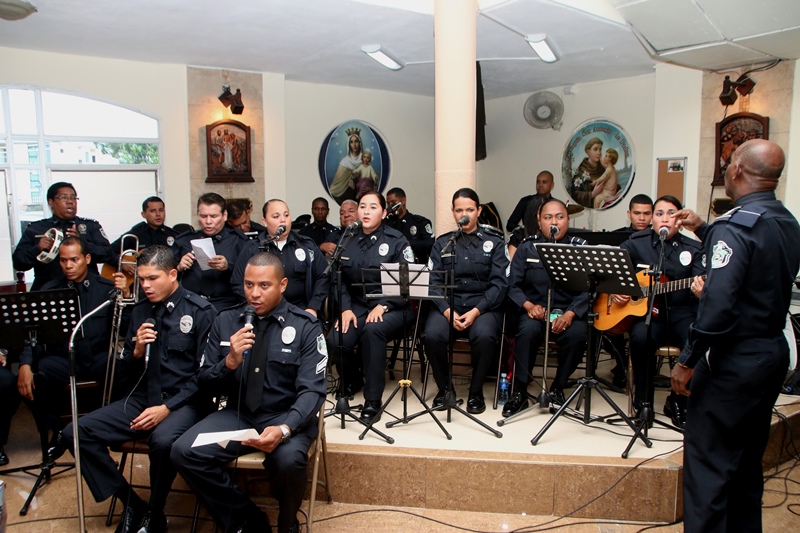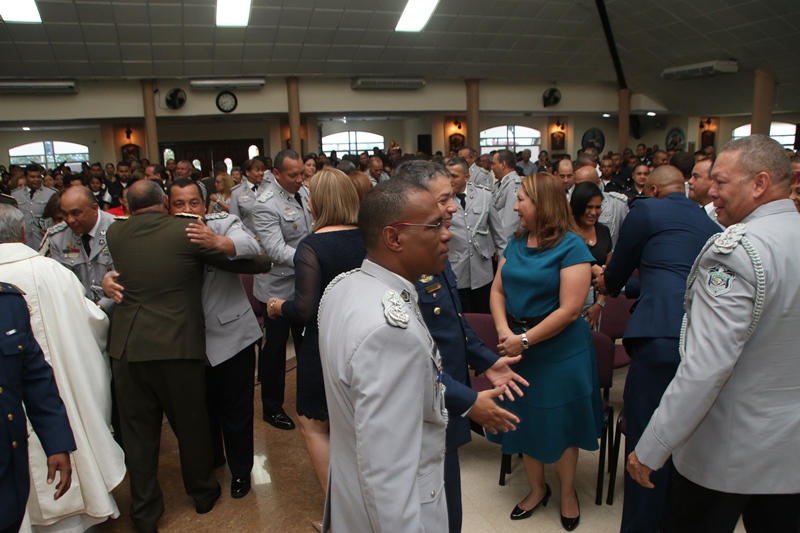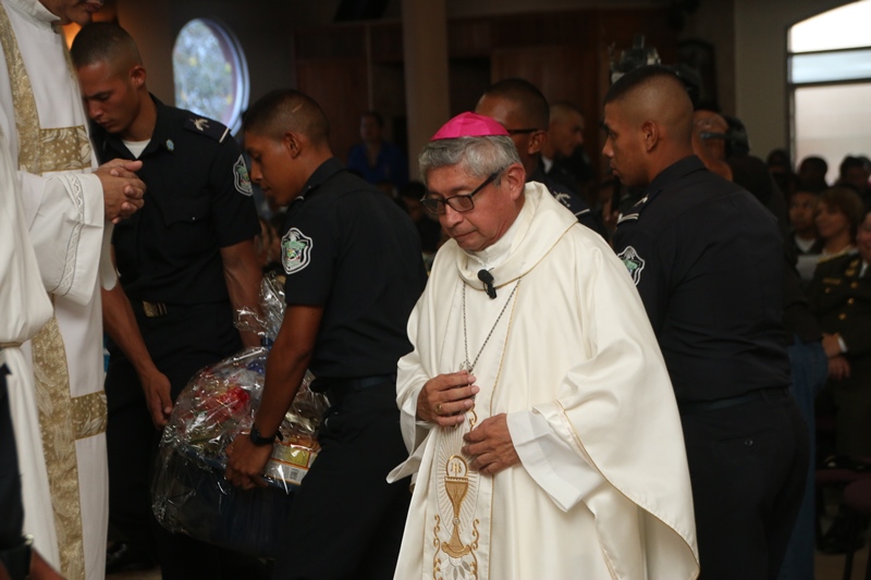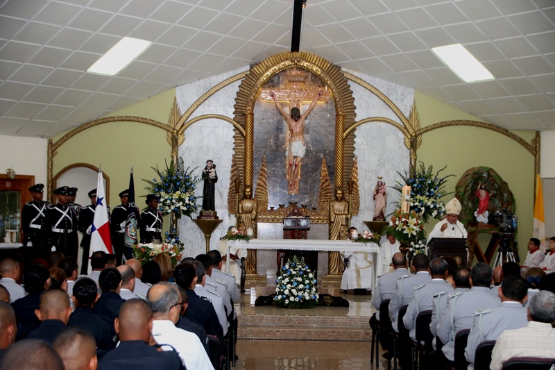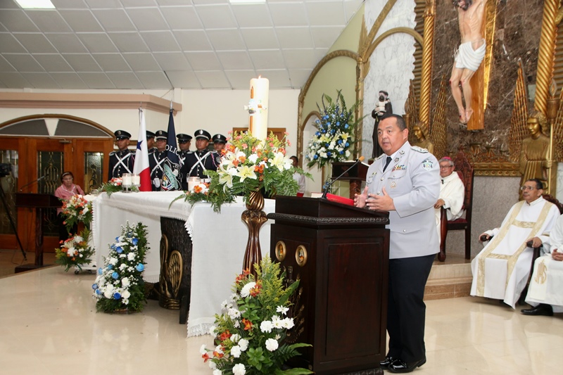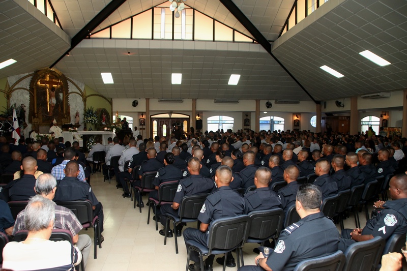 Una misa eucarística presidida por el reverendo Pedro Hernández Cantarero, Obispo del Vicariato Apostólico del Darién fue realizada en la Parroquia San Antonio de Padua en conmemoración del 79 Aniversario de la Policía Nacional de Panamá. También estuvo asistiendo el reverendo Padre Edgar Flores, Capellán de la Policía Nacional y el Padre Juan Sandoval, Párroco de la Iglesia de San Antonio. El Director General de la Policía Nacional, Omar Pinzón y su señora esposa Nacelys de Pinzón además de miembros del Directorio Policial, altos oficiales, mandos medios con sus esposas, familiares y amigos de la institución. “Estamos muy contento por estar aquí, con nuestra iglesia Católica, esta humilde comunidad que es la Policía Nacional y los demás estamentos que nos acompañan, necesitamos fortalecer la labor que realizamos día a día, a favor de ustedes, buscando el fortalecimiento espiritual a través de la Palabra de Dios” expresó el Director de la Policía Nacional Omar Pinzón. Destacó que la Policía Nacional está para “proteger y servir”, pero siempre bajo el paraguas de nuestro señor. El Obispo Hernández Cantarero, les recordó a los miembros de la Policía Nacional, el valor del amor en el desempeño de su labor policial, la cual se deber realizar con entrega e intensidad al servicio de los demás. Para el Obispo Hernández es muy fácil hablar de amor, pero en su opinión esto no es algo que se queda en la superficialidad. “Muchas veces en la vida decimos que amamos pero no hay intensidad, confianza ni valorización que nos dice renuncia a ti mismo y entrégate al servicio de los demás, esa es la realidad de la Policía Nacional en estos 79 años y el tiempo que le queda, porque luego viene el año 80. “Cada día la vida nos está dando hombres sin valores sin sentido, cuando no hay estos, entonces perdemos el sentido de la entrega de la disponibilidad, la integridad y el valor de dar la vida por la patria”, añadió Hernández. El Vicario del Darién recordó que no basta solamente la honradez sino que también es importante la autenticidad, sin ellas todo se queda en nada en el vacío. El amor que es servicial y nos da todo a cambio de nada, nos invita a hacer lo que decía San Agustín, ama y haz lo que sea. Que todo lo que hagas sea por amor. “Como dice San Juan de La Cruz, a la caída del ocaso, Dios te pedirá cuenta de tu amor, no de tu honradez ni intensidad. Y como dijo Jesucristo cuando ustedes se amen de verdad, entonces conocerán que son mis discípulos”, destacó Hernández.