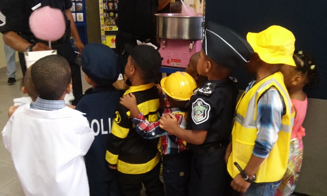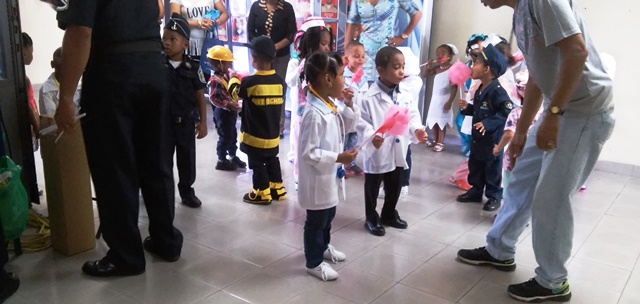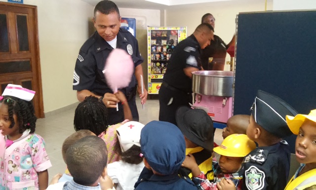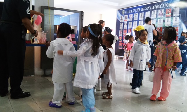 Niños y Niñas del centro de orientación infantil Santa Inés, ubicado en la calle 11 Paseo Gorgas, visitaron las instalaciones de la zona policial de Colón. Los infantes quienes están celebrando el día del trabajo estaban vestidos con los uniformes que representan las diferentes profesiones. El subcomisionado Ceferino Villareal, recibió a los pequeños explicándole el trabajo que realiza la policía le señalo que los policías son sus amigos y están para protegerlos. A los niños se le entregaron golosinas y regalos. |