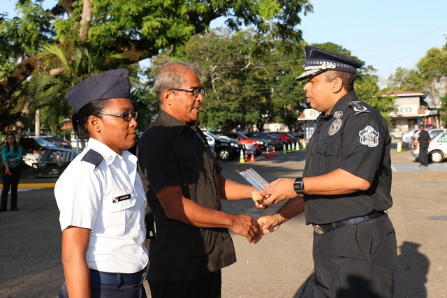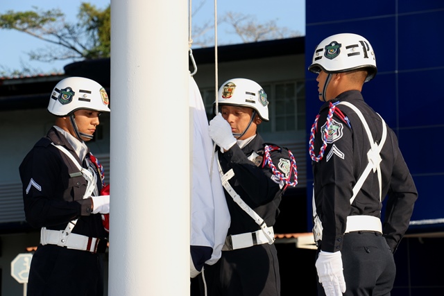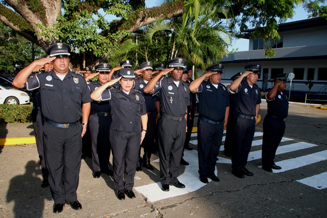 El Director General de la Policía Nacional, Omar Ariel Pinzón Marín resaltó la figura de las unidades policiales quienes son un ejemplo para las generaciones venideras y quienes constantemente dan su vida por el bienestar y seguridad de los panameños. Estas palabras las exteriorizó el Director General de la Policía Nacional durante acto cívico de este 9 de mayo de 2016, que se realizó en la sede policial ubicada en el corregimiento de Ancón y donde se reconoció a las unidades participantes del concurso “Policía Ejemplar”, quienes por sus acciones dentro de su labor policial, fueron reconocidos a través de una ceremonia. El jefe policial alentó a todo el personal que labora dentro de la Institución, a continuar trabajando con el mismo nivel profesional. Agradeció por la esmerada labor que se desarrolló durante todo el mes de abril pasado, en el que se desarrollaron múltiples actividades simultáneas con relación a la celebración del “Día del Policía” y por la disminución de los homicidios y otros delitos en el país. Pinzón Marín quien estuvo acompañado en todo momento por miembros del Directorio Nacional, rindieron un saludo póstumo con una ofrenda floral a los caídos en cumplimiento del deber. También, el comisionado Rafael Álvarez, Jefe del Departamento de Seguridad Ciudadana, distinguió al profesor Ricardo Zúñiga y a la cabo Jhelesky Madrid perteneciente al Servicio Aeronaval (SENAN) por su valioso aporte musical dentro de la inauguración las actividades del mes del policía panameño. Al final de la ceremonia formal, el ganador del concurso “Policía Ejemplar 2016”, el teniente Juan Mosquera, rindió unas palabras de motivación a los uniformados presentes quienes ovacionaron sus consejos de velar por cumplimiento de la transparencia en el servicio policial, el amor a la familia y a la Patria. Al rendir honor a la Bandera, la Policía Nacional renueva la promesa de “Proteger y Servir” a Panamá.
