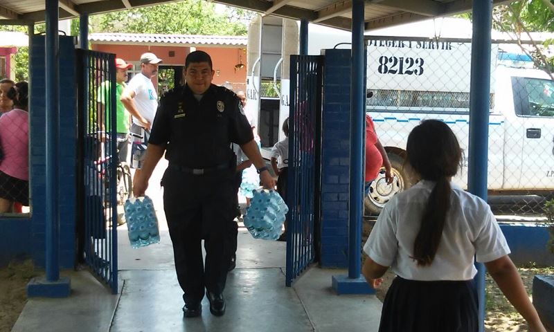 Miembros de la Policía Nacional de servicio en la Zona de Policía de Herrera, entregaron un total de 146 cajas de aguas embotelladas a los estudiantes de escuela primaria de Boca de Parita para aliviar la necesidad del vital líquido. Cabe señalar que la donación fue recibida por estudiantes y docentes del centro de enseñanza, quienes se mostraron muy agradecido con los miembros de la Policía Nacional. Este es el cuarto plantel educativo donde la Zona de Policía de Herrera entrega aguas embotelladas, como una ayuda a que los estudiantes se vean afectados por la falta del vital líquido. |