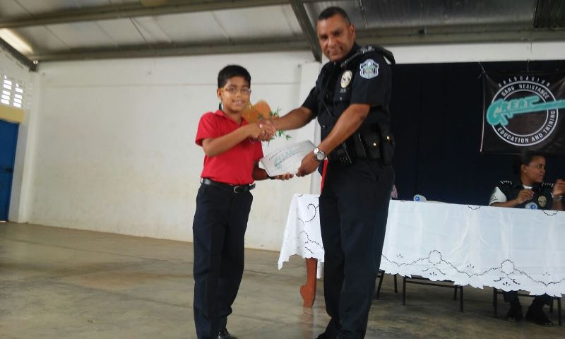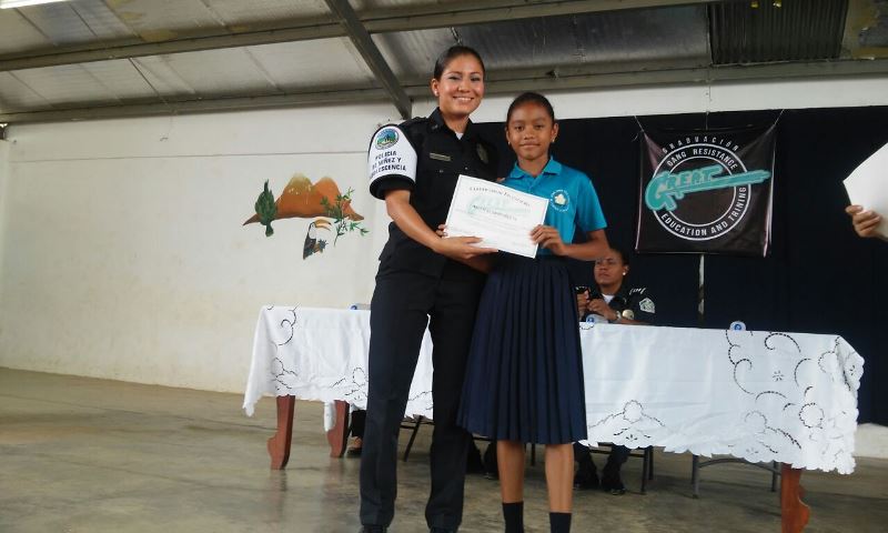 Como parte de los Programas Preventivos de la Policía de Niñez y Adolescencia de Panamá Oeste, 52 estudiantes de 5t0. grado, seleccionados por la dirección de la escuela Zaida Zela Núñez, participaron en el programa G.R.E.A.T (Educación y Entrenamiento en Resistencia a las Pandillas). La Cabo 2do. Yaren Marín, fue la coordinadora y responsable del desarrollo de este programa que tuvo una duración de seis semanas instruyendo a los estudiantes para que no se dejen absorber por el medio y puedan rechazar toda propuesta que los vincule con personas relacionadas con pandillas. Como parte de la jornada, los estudiantes realizaron previo a la graduación del curso, una entrega de canastilla a una humilde señora en el Hospital Nicolás Solano de la Chorrera, de igual manera la entrega de una canasta de comida a una familia del área de La Pesa que está pasando por una situación difícil. Con esta acción se busca inculcar en los niños el valor de la solidaridad. En el acto protocolar de graduación se le entrego certificado de participación a todo los niños y niñas resaltando y premiando aquellos más sobresalientes. Estuvieron presentes en la actividad en representación del jefe de la 10ma. Zona Policial Comisionado Gilberto Samaniego, el subcomisionado Fernando Rivera, la Capitán Ilka Prado encargada de Policía de Menores de Panamá Oeste, la subdirectora del plantel Profesora Elsa de Cedas, estudiantes y padres de familia.