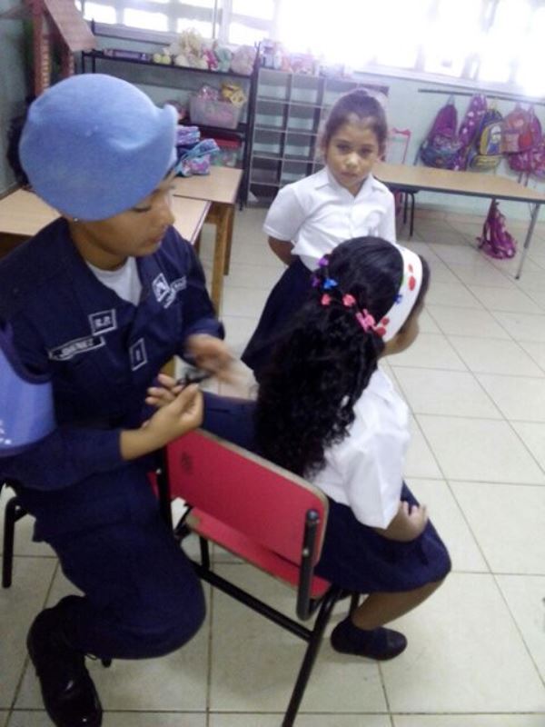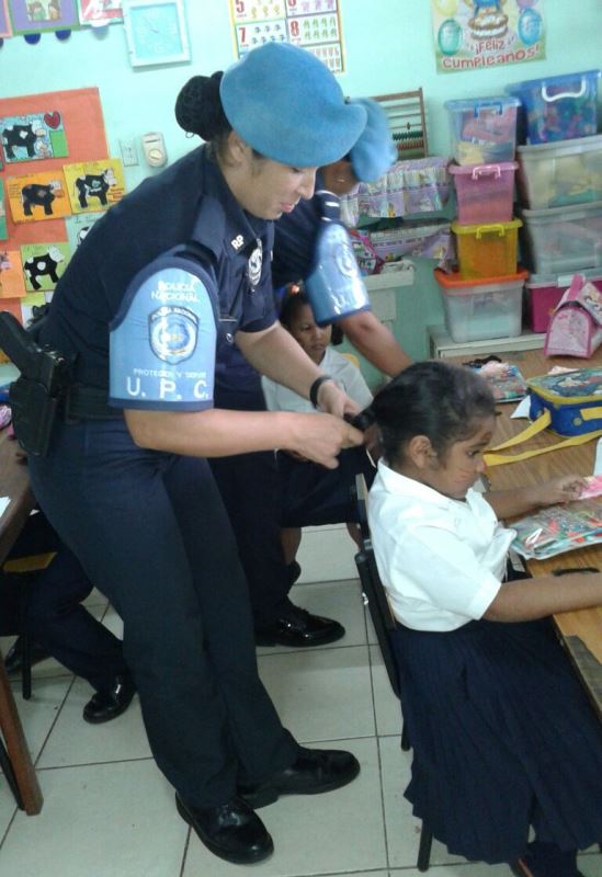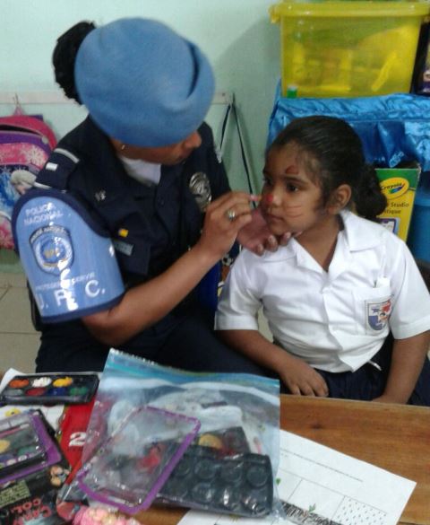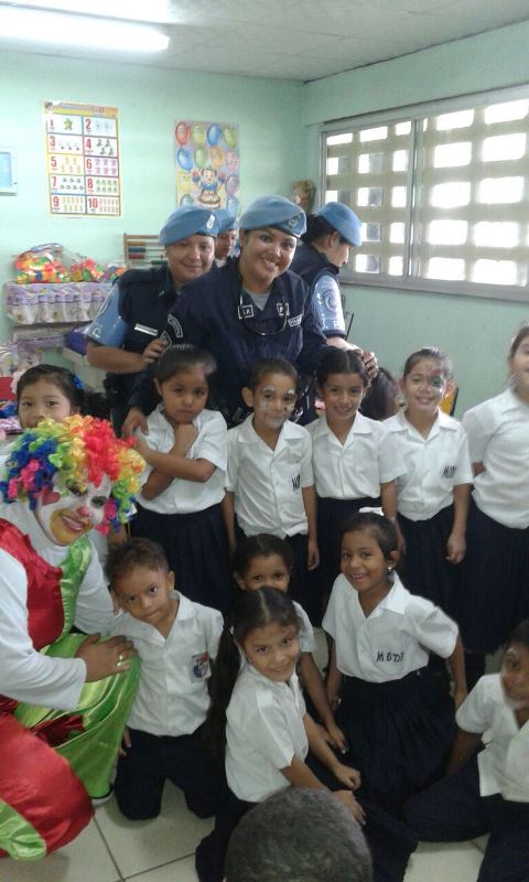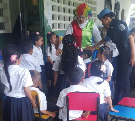 Uniformados de la Unidad Preventiva Comunitaria de Chiriquí (UPC) llevan alegría a niños y niñas de la escuela "María Olimpia de Obaldía" del corregimiento de Pedregal. La Payasita en conjunto con las unidades animaron este evento con diferentes tipos de juegos, les pintaron las caritas a los niños, además les hicieron una serie de peinados con diferentes accesorios (ganchos, binchas, entre otros) por su parte también les impartieron charlas sobre la higiene personal, valores morales, orientación y prevención. Con el fin de convivir con nuestros niños y compartir con ellos esos momentos dándoles alegría y diversión. La sonrisa y agradecimiento de un niño no tiene precio; esta es nuestra mayor recompensa acotó el Capitán Quintero encargado de este grupo policial. |
