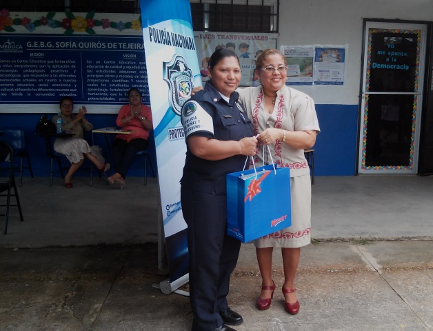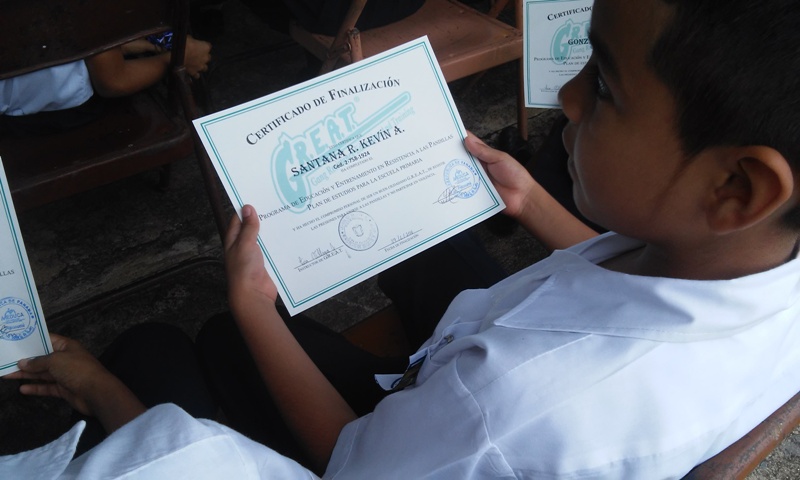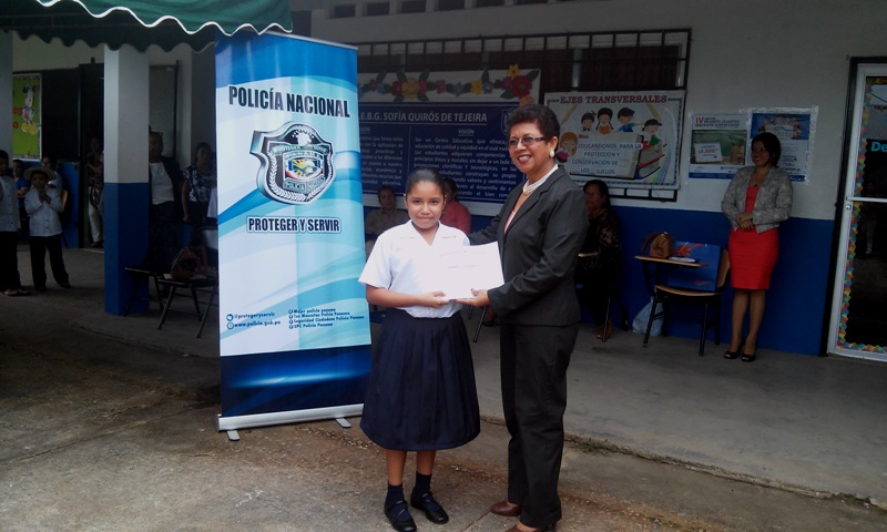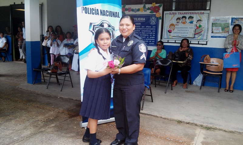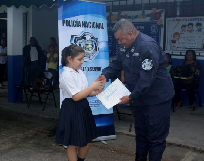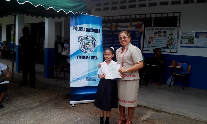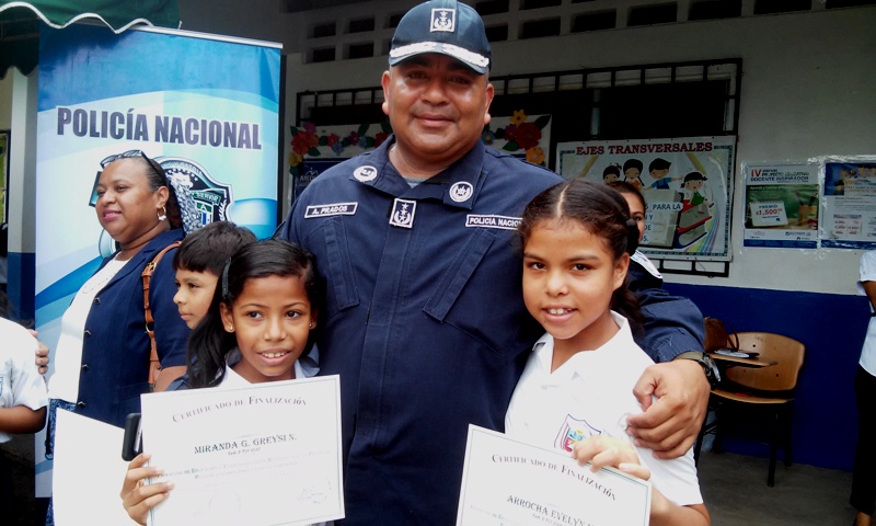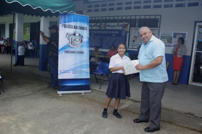 Todo un éxito fue la clausura del programa, Educación y Entrenamiento en Resistencia a las Pandillas (GREAT) de la Policía de Niñez y Adolescencia de la Zona de Coclé en el Centro Educativo Sofía Quirós de Tejeira en Penonomé , donde se graduaron 44 niños de edades de entre 8 a 10 años, que participaron de las 13 semanas que con lleva el programa. El curso fue dirigido por la cabo Eyra Villagra del departamento de Niñez y Adolescencia, quien manifestó su satisfacción al compartir con la población estudiantil, su constante labor preventiva a través del servicio de la Policía, que busca dotar de conocimiento a la niñez y adolescencia de nuestro país para que eviten el uso y abuso de drogas, armas, violencia y pandillas. En el acto estuvieron presentes, el comisionado Aníbal Prados jefe encargado de la Zona Policial, la Magister Agne Vergara directora Regional de Educación, el licenciado Jorge González Superior de la Zona 15 de Educación , la profesora Marisol Coronado directora de la escuela, invitados especiales, educadores, administrativos, padres de familias y el público que acompaño. En el desarrollo del programa, hay que destacar la participación del niño Javier Bermúdez Chávez del Quinto grado, quien deleitó a los presentes con una décima de Torrente Valdivieso dedicada a la Policía Nacional y el programa de Educación y Entrenamiento en Resistencia a las Pandillas, en la guitarra acompañó el Cabo Víctor Valdez de la Zona de Coclé. El jefe de Zona el comisionado Aníbal Prados manifestó que estos programas son de beneficio porque se orienta y brinda información de diversos temas que tratan sobre las causas y consecuencias para que no sean víctimas de las malas influencias. También dijo que próximamente se estará efectuando graduaciones en el área de Nata, Toabré y Penonomé. Se hizo entrega de certificados a los niños, como también obsequio para los tres primeros lugares como a Bethancourth Owen, Valencia Itsel y González Marcos todos del IV grado. En tanto la directora del plantel profesora Marisol Coronado hizo entrega de un obsequió, a la cabo Eira Villagra, en reconocimiento por su labor de entrega para con los niños con quienes compartió sus conocimiento en materia de prevención.