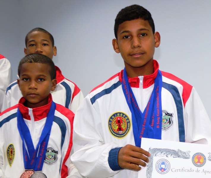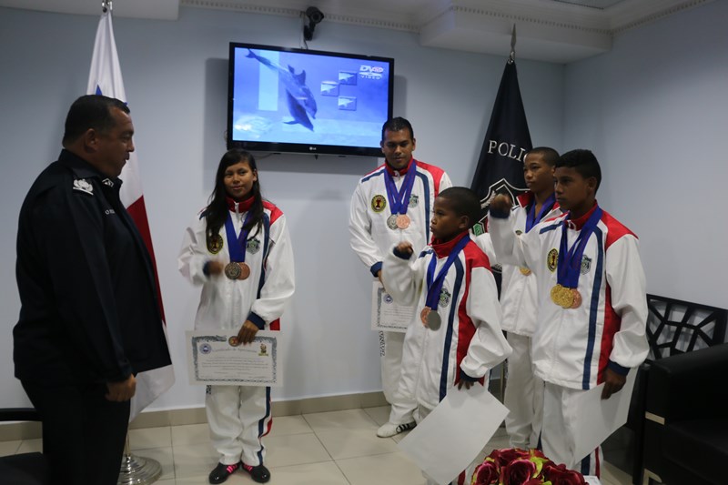 El Director General de la Policía Nacional, Omar Ariel Pinzón Marín y el Subdirector General, Javier Castillo recibieron en la sede de la institución, a los guerreros de la escuela de Tan Soo Do Kwan de la Unidad Preventiva Comunitaria (UPC) de la Policía Nacional, tras ganar 11 medallas en el Torneo Internacional de esta disciplina realizado en Puerto Rico. Se trata de cuatro niños del corregimiento de Curundú, quienes compitieron en el Campeonato Abierto de Tang Soo Do Bi Sang Kwan 2016, donde cosecharon medallas, 3 de oro, 3 de plata y 5 de bronce. Estos jovencitos defendieron los colores de la Bandera Nacional al competir con representantes de Aruba, Estados Unidos, Curazao, Chile y Puerto Rico. Este lunes en horas de la mañana el Director General, Omar Ariel Pinzón Marín, los recibió y exhortó a seguir siendo ejemplo en su comunidad. “Ustedes han demostrado su grandeza al representar al país y triunfar en el exterior”, destacó Pinzón Marín mientras veía una de las medallas obtenidas por uno de los competidores. El Director General estuvo acompañado por el Subdirector General de la Policía Nacional, Javier Castillo. Esta delegación estuvo compuesta por el teniente e instructor Royván Rudas y cuatro niños del programa de artes marciales de la UPC: Carlos Martínez, de 15 años; Sharol Castillo, de 14 años; Jeremy De León, de 13 años; y Roderick Londoño, de 11 años. Sus edades oscilan entre los 8 a 18 años y si estás interesado, puede inscribir a tu hijo (a) sin ningún costo. Para mayor información puedes llamar a los teléfonos: 511-9250/48/68.