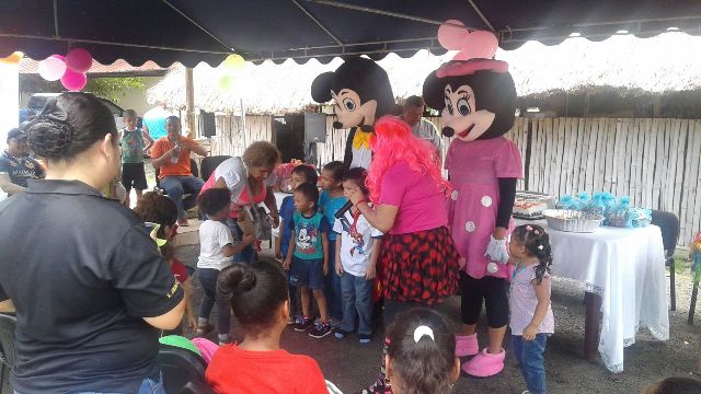 En el marco de la conmemoración del Día del Niño y la Niña, unidades de la Policía Nacional de servicio en la 5ta Zona Policial de Panamá Este, agasajaron a sus hijos y niños del distrito de Chepo. Esta actividad que se realizó en los predios de esta sede policial, contó con más de 100 niños y niñas hijos de los miembros que laboran en esta zona policial, así como también niños de las diferentes comunidades chepanas. Entre risas los niños compartieron con “Mickey y Miny” personajes de Disney, gratos momentos de esparcimiento. Correspondió a la payasita "Teresita" amenizar el evento, pintando sus caritas y disfrutando de diversos juegos. Después de un rico almuerzo, cada uno de los niños (as) participantes recibieron por parte del Comisionado Abdul Ledezma, jefe de la zona, un presente.