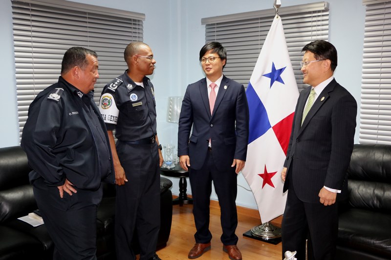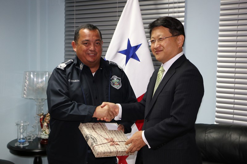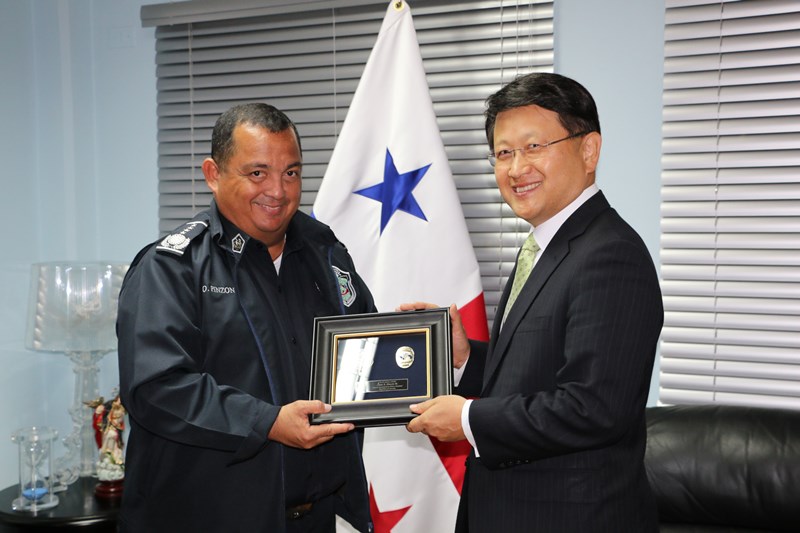 El Director General de la Policía Nacional Omar Ariel Pinzón Marín, recibió la grata visita de cortesía del embajador de Corea, el Señor Sahng Hoon Bahk, en sede principal de la Policía Nacional, ubicada en Ancón. Durante su visita el diplomático, se reunió con el Director de la Policía Nacional Omar Pinzón y el Sub Director Javier Castillo, donde tocaron varios temas sobre seguridad ciudadana y la prevención antiterrorista, así como las medidas de protección para los nacionales coreanos en Panamá. El Director General de la Policía Nacional Omar Pinzón, señaló que es muy importante el intercambio de información y constante comunicación con los diplomáticos de la republica Coreana, para así entablar investigaciones conjuntamente. Pinzón hizo entrega de un presente institucional al diplomático Honn, mientras que este a su vez también entrego un obsequio a el jefe de la Institución Policial. El embajador Sahng Hoon Bahk reconoció los esfuerzos de la Policía Nacional para asegurar la seguridad y la orden pública de Panamá. |