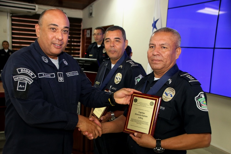 Cinco unidades de la Policía Nacional de servicio en la Dirección Nacional de Administración y Finanzas de la Policía Nacional fueron distinguidas durante una ceremonia realizada este lunes 1 de agosto 2016, en el Salón de Conferencias de la sede ubicada en el corregimiento de Ancón, tras cumplir 30 años de servicio, que les permite acogerse a la merecida jubilación. El Director General de la Policía Nacional, Omar Ariel Pinzón Marín los felicitó por ser ejemplo de trabajo, esfuerzo y superación, que contribuyeron a la excelente labor de la institución, a la vez que los invitó a seguir siendo parte de la misma y hacer sus aportes como miembros reservistas. Le correspondió al Subdirector General, Javier Castillo y al Subdirector de Asuntos Penitenciarios, David Ramos entregar placas y la medalla de la Dirección Nacional de Administración y Finanzas, a los capitanes Carmen Rubio, Elsa Trejos, Luis Ospino, Eric Leguisamo y Dionisio Gaitán. Por su parte, el Director Nacional de Administración y Finanzas, Gabriel Medina dijo sentirse satisfecho por los aportes de estos oficiales comprometidos y proactivos con el buen uso de los recursos de la Policía Nacional, través de esta dependencia policial. La ceremonia es parte de las actividades de aniversario de la Dirección Nacional de Administración y Finanzas que cumple 47 años de ser responsable de la administración de los recursos financieros y logísticos de la Policía Nacional. |