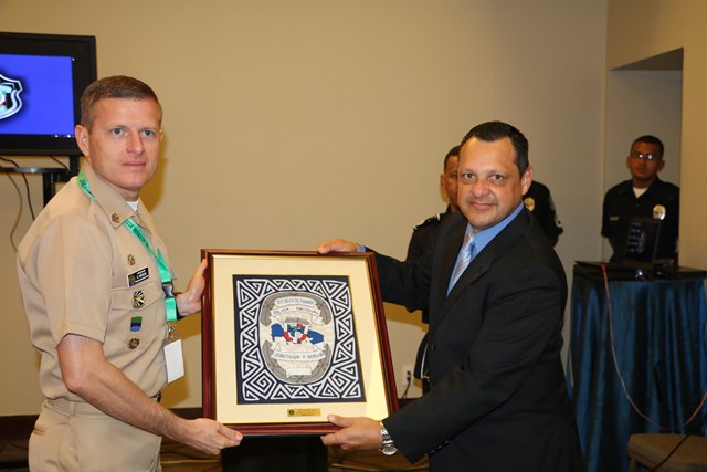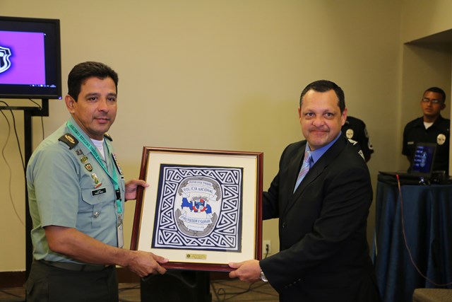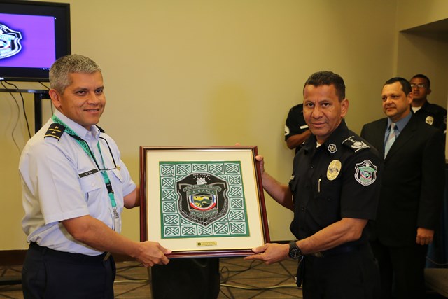 La Policía Nacional participa de la XI Comisión Binacional Fronteriza (COMBIFRON) que se lleva a cabo en Panamá desde el 2 de agosto, acto que fue propicio para la entrega de reconocimientos a altos mandos de los estamentos de seguridad de Colombia, en agradecimiento por la labor que realizan en conjunto con autoridades panameños. Le correspondió al Subdirector General de la Policía Nacional, Javier Castillo hacer la entrega de dos cuadros con el escudo de la Policía Nacional en Mola al Brigadier General, Jorge Arturo Salado y al Coronel Carlos Fernando Silva. “Estamos muy agradecido por la labor que se realiza en conjunto, por lo que a nombre del Director General Omar Ariel Pinzón Marín y las más de 18 mil unidades entregamos estos significativos reconocimientos de gran valor para nuestra institución” resaltó Castillo. En tanto, el comisionado y director de la Dirección Nacional de Inteligencia Policial, José María Huertas, entregó reconocimientos con la placa de la Policía Nacional al Coronel Carlos Felipe Ortega y al Coronel Ramiro Iván Pérez, agregado policial de Colombia en Panamá. Del 2 al 5 de agosto en esta XI Comisión Binacional Fronteriza, se trataran temas de seguridad, migración, con el objetivo de garantizar la seguridad y la lucha contra el narcotráfico. |
